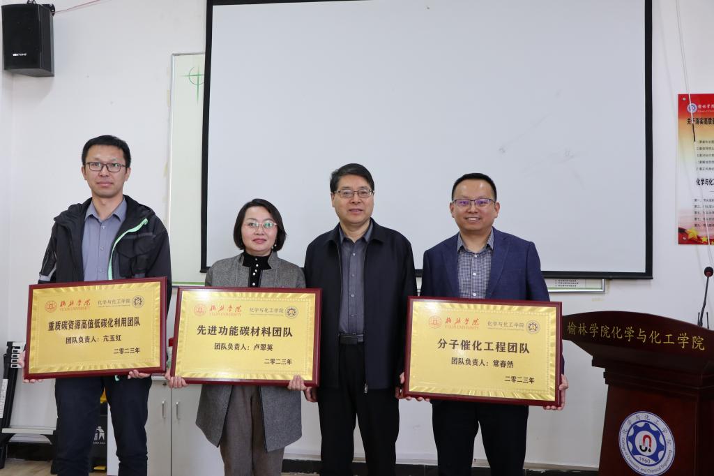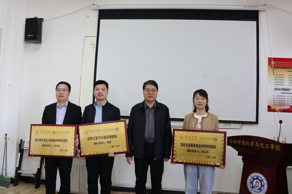调研座谈期间,张新柱为化学与化工学院的氢能及金属基复合材料科研团队、洁净兰炭与污染控制团队、废弃物资源化与环境材料研究团队、分子催化工程团队、先进功能碳材料团队、重质碳资源高值低碳化等六个科研团队的代表授牌。