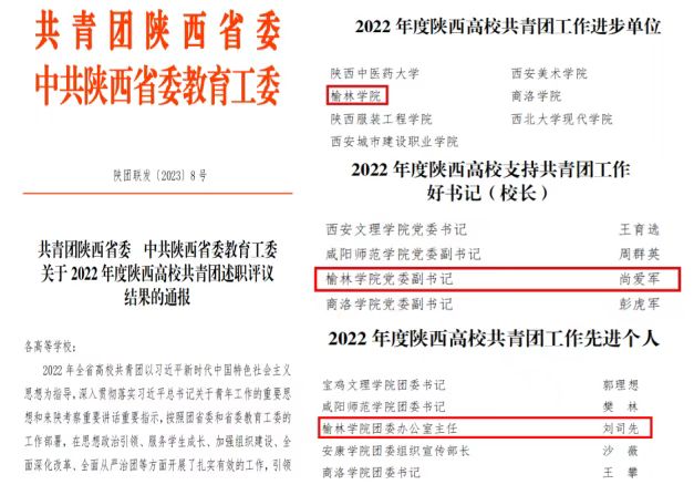 近日,共青团陕西省委、中共陕西省委教育工委印发了《关于2022年度陕西高校共青团述职评议结果的通报》,bat365正版唯一官网团委荣获“2022年陕西高校共青团工作进步单位”称号,党委副书记尚爱军荣获“2022年度陕西高校支持共青团工作好书记”称号,团委办公室主任刘司先荣获“2022年度陕西高校共青团工作先进个人”称号,实现了bat365正版唯一官网共青团工作新的突破。