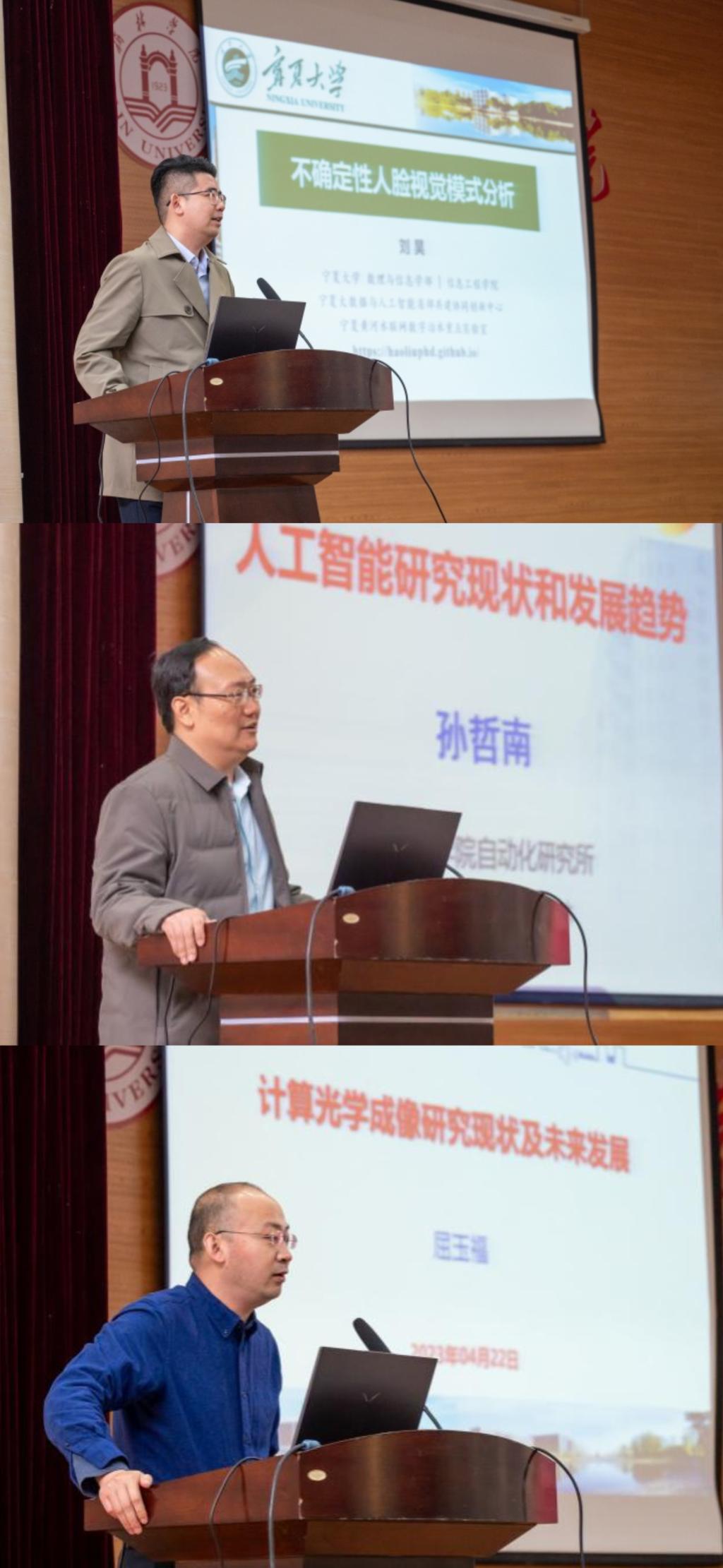 中国科学院自动化研究所研究员、博士生导师、天津中科智能识别产业技术研究院院长孙哲南,北京航空航天大学教授、博士生导师、中国图象图形学学会视觉检测专业委员会秘书长屈玉福与宁夏大学教授、博士生导师刘昊,分别做了“人工智能研究现状和发展趋势”、“计算光学成像研究现状及未来发展”与“不确定性人脸视觉模式分析”学术报告。在自由问答互动环节,参会教师、学生与专家就报告主题进行了深刻的讨论交流,各位专家就教师、学生提出的相关问题给予了耐心细致的解答。