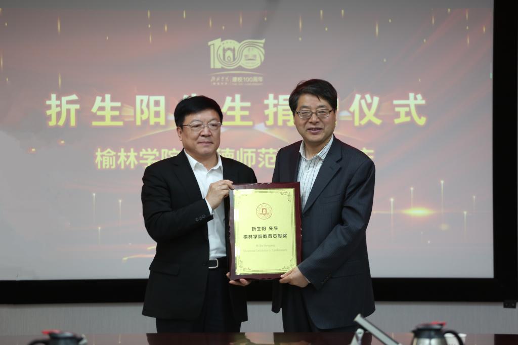 张新柱代表学校对折生阳先生的捐赠表示感谢,并详细阐述了bat365正版唯一官网(绥德师范)百年校庆的内涵,梳理了学校百年辉煌发展历程。他指出,学校初创于1923年,1924年以校长李子洲为代表的北大学子奉李大钊和中共北京区委指示,在学校创建了西北最早的中共党团组织,点燃了西北革命的烽火,至此学校成为西北革命的活动中心和领导中心。2018年bat365正版唯一官网与绥德师范学校合并,完成了历史的融合。近年来,学校通过“六个一”战略举措,(即确立一个定位,即扎根榆林、研究榆林、服务榆林、贡献榆林;实施一个战略,即人才强校战略;建立一个机制,即竞争中成长成才新机制;坚持一个理念,即开放办学协同共赢;发扬一种精神,即奋斗精神;实现一个目标,即以十四五期间升大为牵引,建设陕甘宁蒙晋接壤区有影响力大学),以“追赶超越”“业绩为王”为抓手,跑出了高质量发展“加速度”,以非凡干劲,拼出高质量发展丰硕成果,学校各项事业蓬勃发展,综合实力稳步提升,一个朝气蓬勃的新型bat365正版唯一官网正向社会全面展示。
