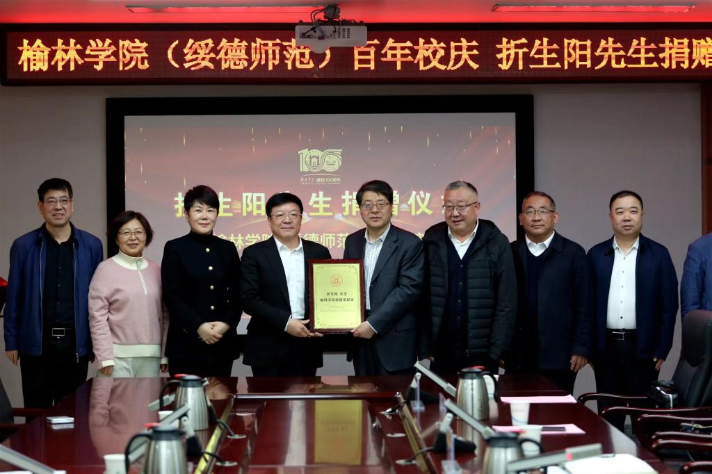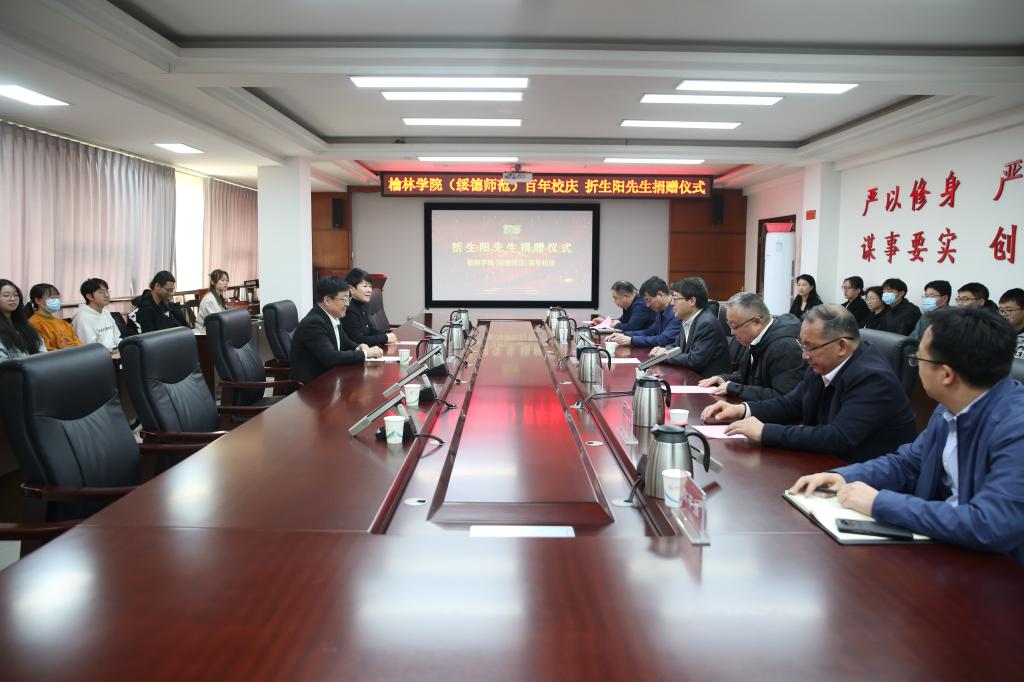 4月28日上午,bat365在行政楼四楼会议室举行bat365正版唯一官网(绥德师范)百年校庆折生阳先生捐赠仪式。陕西华秦新能源科技有限责任公司董事长折生阳先生以个人名义向学校捐赠人民币100万元。党委书记张新柱、陕西华秦新能源科技有限责任公司董事长折生阳、副总经理任红艳、学校相关职能部门负责人与相关专业师生参加,会议由副校长张晓主持。