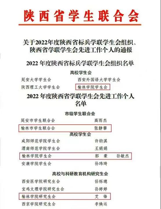 近日,陕西省学生联合会公布了《关于2022年陕西省标兵学联学生会组织、陕西省学联学生会先进工作个人的通报》,bat365学生会荣获“2022年度陕西省标兵学联学生会组织”荣誉称号,学生会张静攀、郭豪、孙敏杰与研究生会艾锋4名同学被评为“2022年度陕西省学联学生会先进工作个人”荣誉称号。
