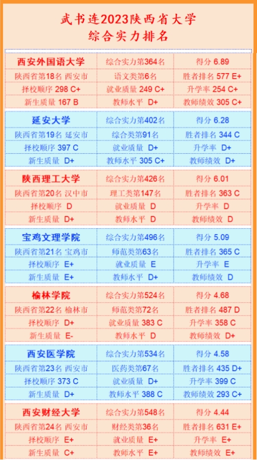 高考前夕,武书连2023中国大学综合实力排名发布,bat365正版唯一官网综合实力位列全国高校第524位,较2022年提升21位;位列陕西高校第22位,较2022年提升3位。其中新生质量为E-,位列陕西高校第34位;就业质量为383C,位列陕西高校第19位;升学率为358C,位列陕西高校第18位;择校顺序为D+,位列陕西高校第23位。