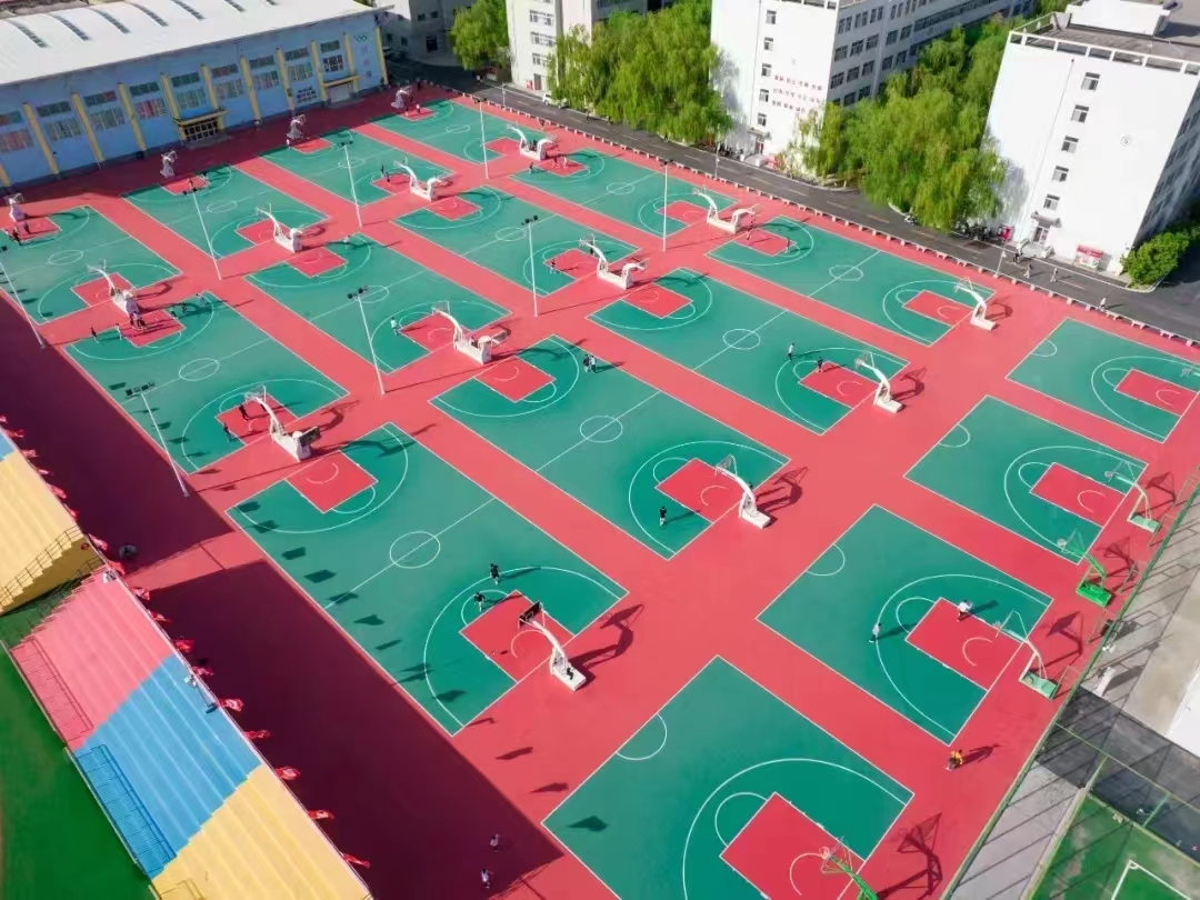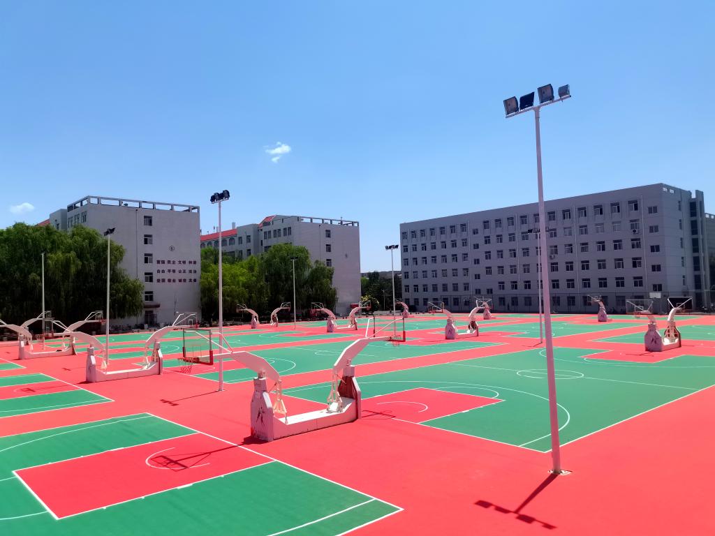 学校历来重视丰富师生课余文体活动,室外篮球场作为运动热门场地,因长期高频率使用,场地老化,地面磨损严重,标线斑驳不清,严重影响了师生运动的愉悦感和积极性。此次篮球场馆地面全部采用软塑悬浮地板拼装。改造后的篮球场馆色彩靓丽、标线清晰,热情的红色增强了场馆的运动氛围,清新的绿色减轻了打球时的视觉疲劳;新铺设的地面,环保防滑,耐磨弹性好,在增加安全性的同时,大大提升了运动体验感。
