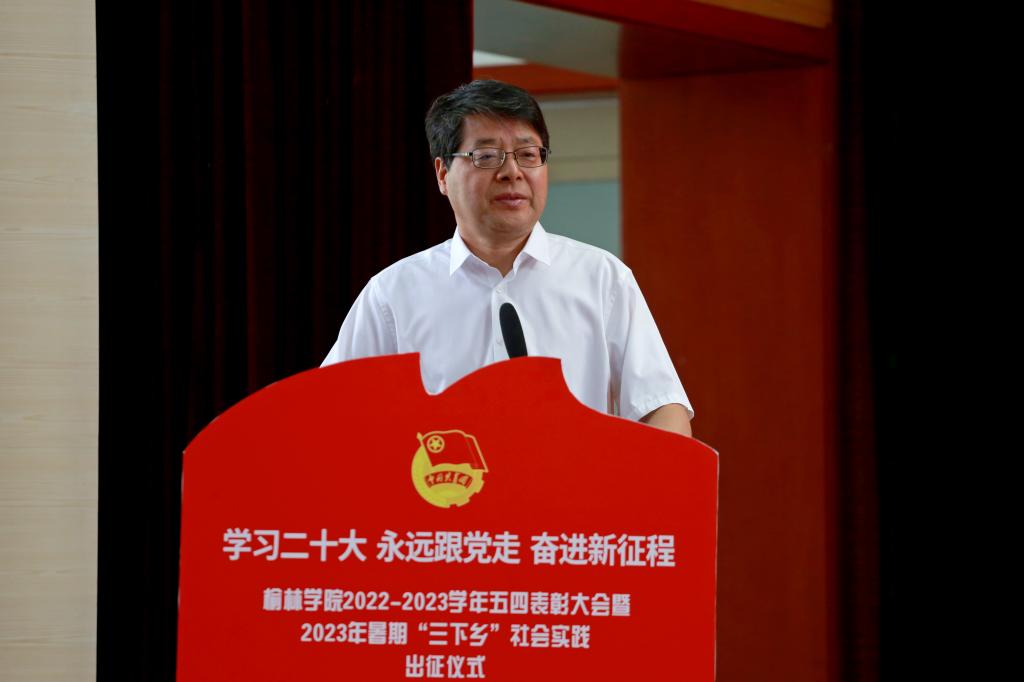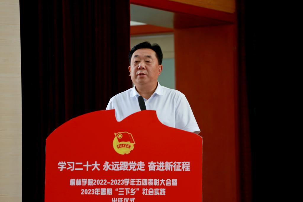 尚爱军作动员讲话。他指出,暑期“三下乡”社会实践活动是青年学生磨炼意志、砥砺品格的有效形式,是青年人求真知识、练就本领的重要途径,更是青年学生奉献社会、逐梦圆梦的广阔舞台。校党委高度重视大学生社会实践活动,推出“五乐育人”活动,引导全员参与生动实践,创新探索立德树人具像化、三全育人生动化、五育并举融通化、育人考核数据化,着力培养德才兼备、身心健康、全面发展的“榆苑奋斗新青年”。同时,还坚持以促进学生全面成长成才为目标,紧跟时代步伐、紧扣时代主题,精心设计活动内容,将学生社会实践和“大思政课”育人格局相互交叉,构建互通互融模式,实现育人目的。他向“三下乡”社会实践师生提出三点希望,一是希望同学们践行初心、担当使命,在社会实践中坚定理想信念、厚植爱国情怀。同学们要积极投身社会实践,将学习专业知识和社会发展需要相结合,将锤炼过硬本领和祖国建设需要相结合,将社会实践内容和群众实际需要相结合,将立足脚踏实地和青年责任担当相结合,扎根乡村、服务当地,经受考验、增长才干,凝聚智慧、贡献力量。二是希望同学们珍惜时光,不负韶华,在社会实践中勇于砥砺奋斗、锤炼过硬品格。广大师生要传承好红色基因,发扬伟大奋斗精神,将其有机融入每一位榆苑人的精神血液和实际行动,用红色校史资源铸魂育人、启智润心,争做理实交融、红专并进、堪当重任的时代新人。三是希望同学们立足专业,学以致用,在社会实践中理论联系实际、坚持知行合一。社会大学是一门必修课,期待同学们在大江南北、在田间地头弘扬奋斗精神、讲好bat365正版唯一官网故事、展示青春风采,书写无愧于时代和人生的绚丽华章!最后,他特别强调,暑期社会实践团师生要筑牢“安全第一”防线,守住“平安第一”底线,杜绝麻痹思想、侥幸心理,制定安全预案,细化分工,压实责任,师生各司其职,圆满完成暑期实践任务。
