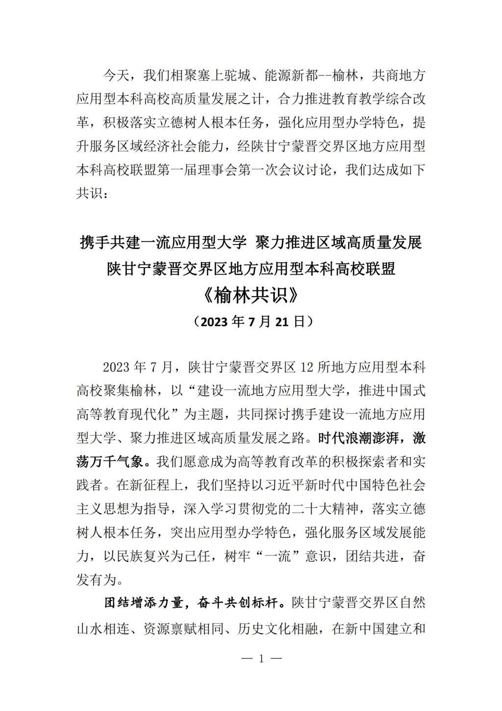 经2023年7月21日“陕甘宁蒙晋交界区地方应用型本科高校联盟”成立预备会暨第一届理事会第一次会议讨论,达成了符合联盟建设与发展的《榆林共识》,现予以发布: