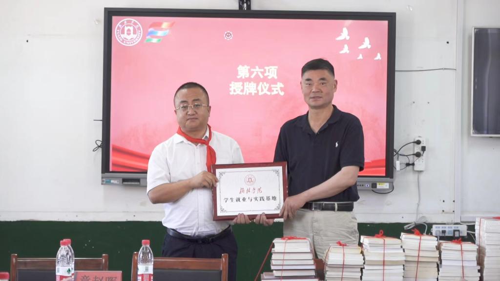 座谈会后,张新柱向三官会社区授“大学生社会实践基地”牌匾,向三下乡实践队的学生赠送路遥经典名作《人生》。