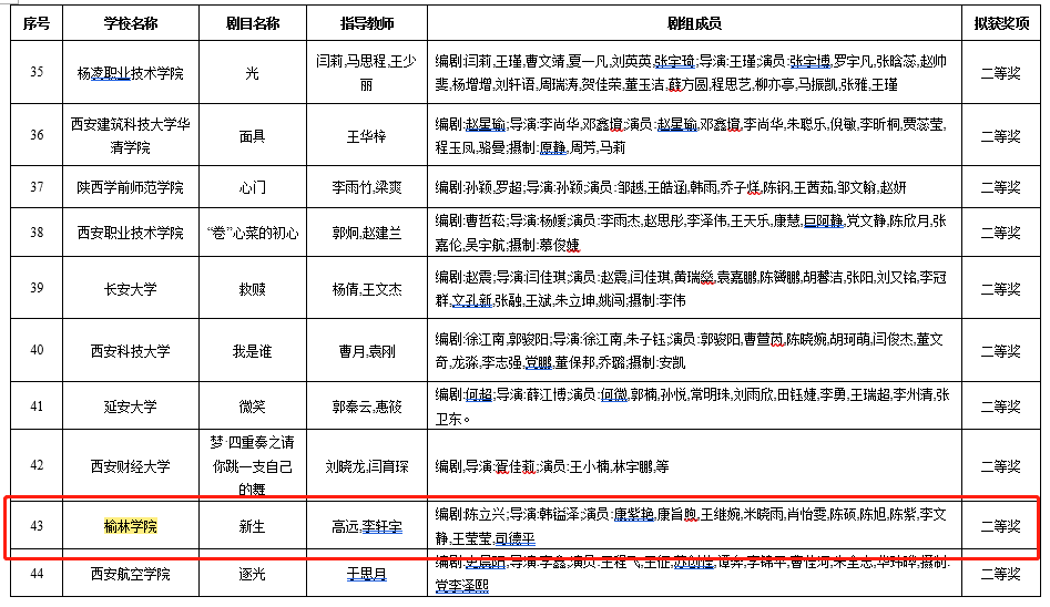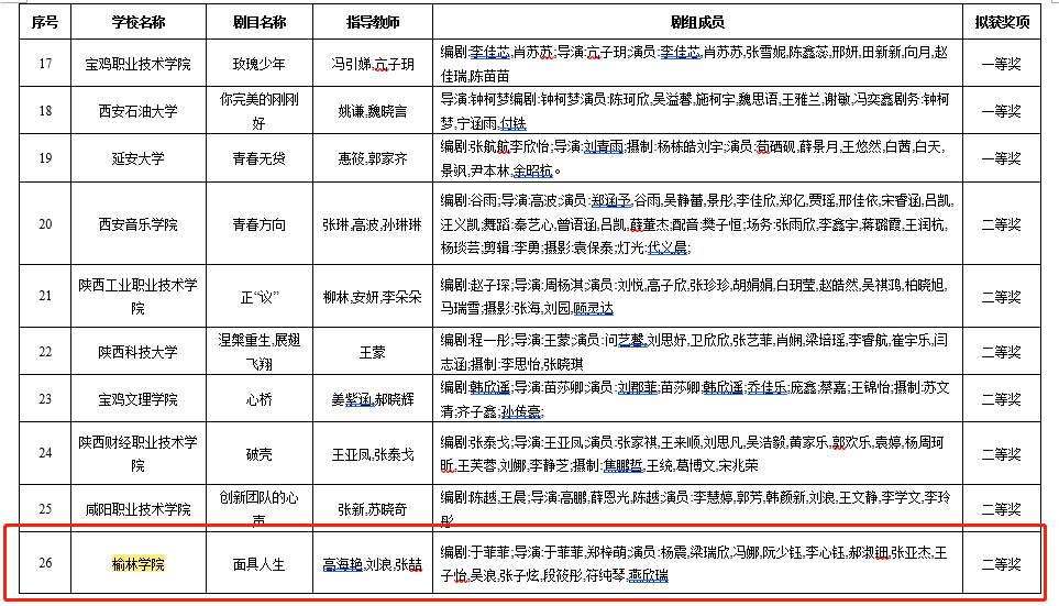 近日省教育厅公布了拟表扬名单,由bat365数学与统计学院报送的心理情景剧《面具人生》和管理学院报送的《新生》在第五届陕西高校校园心理情景剧评选中获得二等奖;由文学院选送的“榆苑奋斗队”代表学校在第六届陕西高校大学生心理健康科普知识竞赛暨心理素质拓展运动嘉年华活动中获得三等奖。