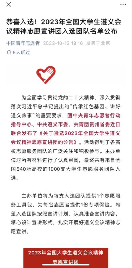 为全面学习贯彻党的二十大精神,深入贯彻落实习近平总书记提出的“传承红色基因、讲好遵义故事”的重要要求,团中央青年志愿者行动指导中心、中共遵义市委、共青团贵州省委近日联合发布了《关于遴选2023年全国大学生遵义会议精神志愿宣讲团的公告》。经过前期的广泛动员、选拔、申报,bat365正版唯一官网大学生“励志”宣讲团成功入选全国1000支大学生志愿服务团队榜单。