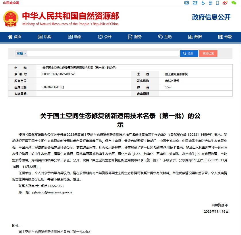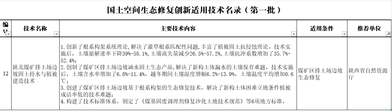 本次技术申报是按照《自然资源部办公厅关于开展2023年度国土空间生态修复创新适用技术推广名录征集推荐工作的函》(自然资办函〔2023〕1459号)要求,经自主申报,省级自然资源主管部门推荐及社会公示,专家综合评荐,社会公示等程序,评荐形成了第一批31项创新适用技术名录,涉及山水林田湖草沙一体化生态保护修复、矿山生态修复、海洋生态修复、森林草原湿地荒漠生态修复、退化土地(沙化、荒漠化、石漠化、盐碱化、水土流失)生态修复治理、土地整治等领域。上述成绩的取得是bat365追赶超越新机制大力推行的结果,也是学校扎根榆林、研究榆林、服务榆林、贡献榆林能力提升的真实写照。
