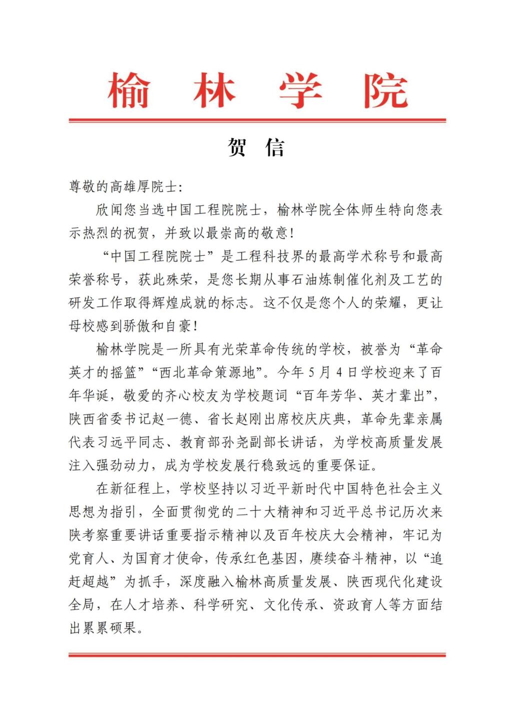 bat365正版唯一官网致杰出校友高雄厚当选中国工程院院士的贺信