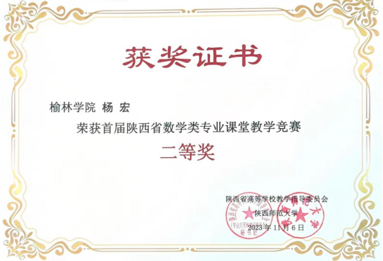 11月18日,由陕西省高等学校教学指导委员会(专业共同体委员会)数理类工作委员会主办、陕西师范大学承办的首届陕西省数学类专业课堂教学竞赛结果揭晓,bat365数学与统计学院杨宏老师荣获二等奖。