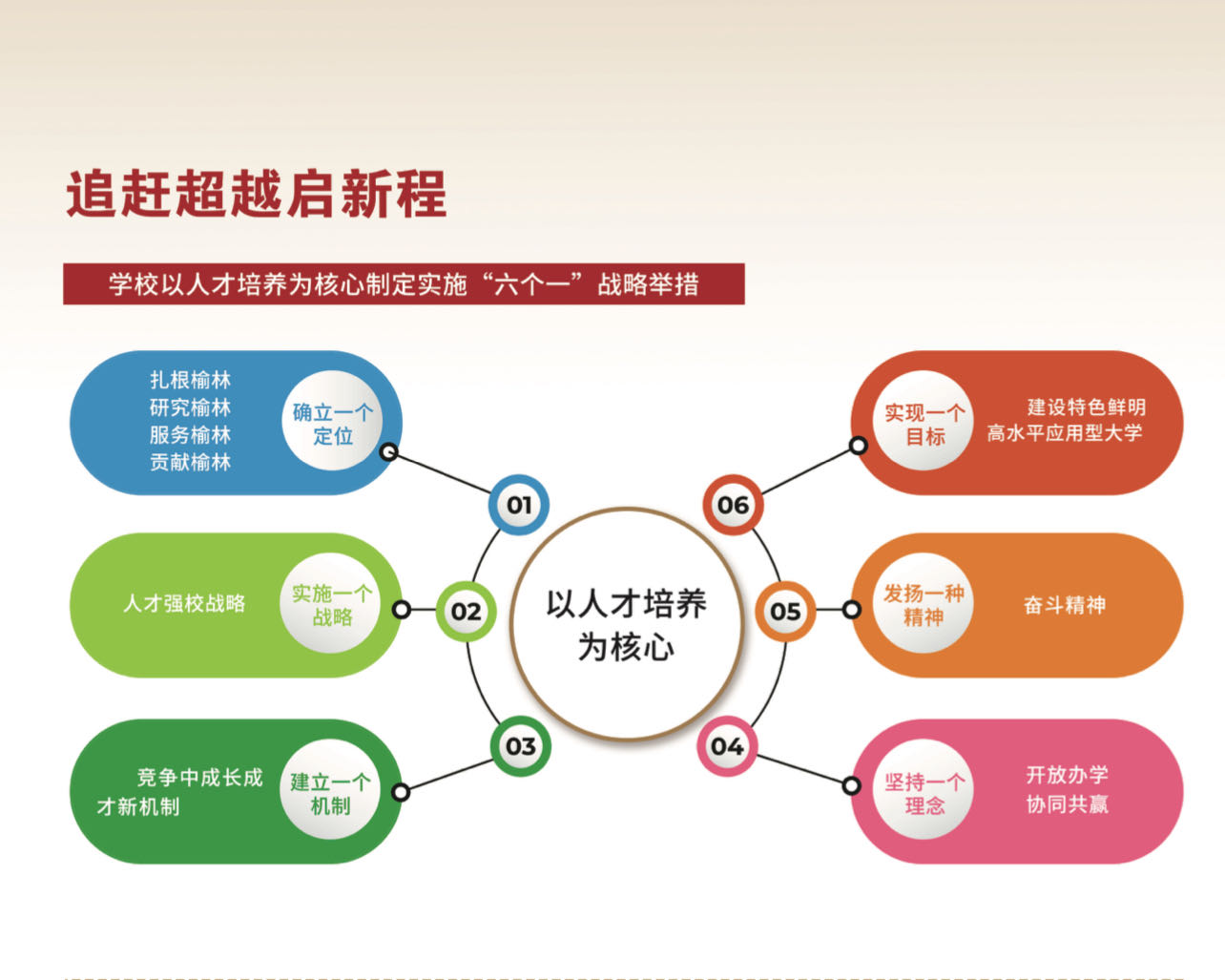 二是顶层设计谋划迈出新步伐。学校党委班子严格落实“约法十章”,带头抓好“十个落实”,积极“跑三”;处级干部“三晒三看”比水平、比能力、比担当;教师们强教学,争项目;让躺平者站起来,让慢步者跑起来。为确保学校“十四五”发展规划确定的目标任务稳步推进,结合发展实际,以人才培养为核心,制定实施“六个一”战略举措:确立一个定位,即扎根榆林、研究榆林、服务榆林、贡献榆林;实施一个战略,即人才强校战略;建立一个机制,即竞争中成长成才新机制;坚持一个理念,即开放办学协同共赢;发扬一种精神,即奋斗精神;实现一个目标,即以高质量发展为牵引,建设特色鲜明的一流应用型大学。学校瞄准国家重大战略和区域经济社会发展需求,结合区域资源优势、产业发展特点,突出应用型办学特色,始终坚持本土化、特色化、差异化发展之路,战略目标更加清晰,发展动能愈发强劲。
