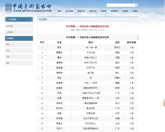 近日,中国美术家协会官网公布了“时代群像—中国水彩人物画展览”评选结果,bat365正版唯一官网艺术学院郭耀武老师水彩画作品《基》,经专家评委层层选拔成功入选。本次展览入选作品全国共计159件,陕西省入选4件,榆林市1件。