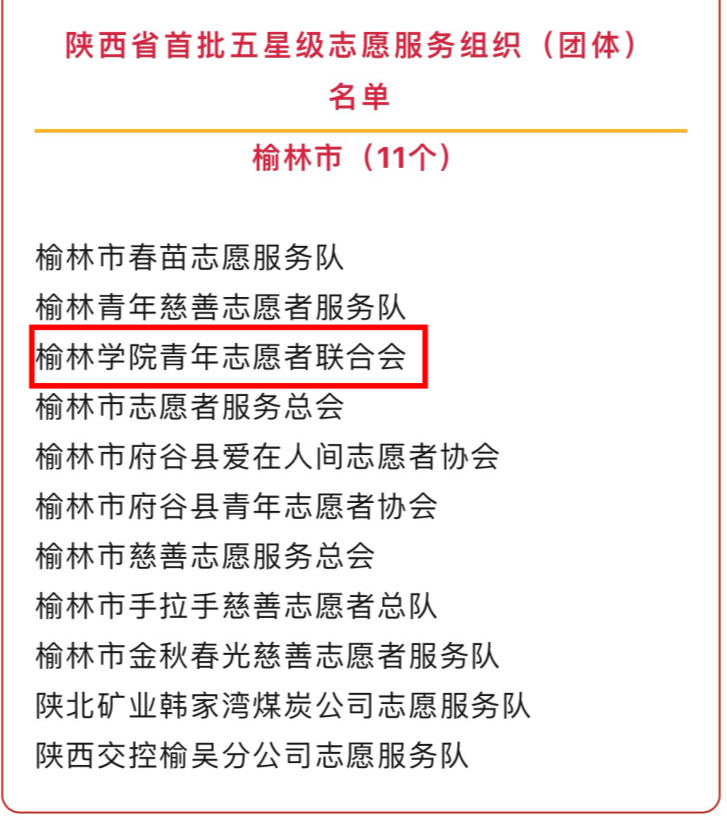 近日,省委文明办组织开展了我省首届五星级志愿者、志愿服务组织(团体)评定工作,鼓励激励广大志愿者、志愿服务组织,不断发展壮大学雷锋志愿服务队伍,让雷锋精神在新时代绽放更加璀璨的光芒。通过基层推荐、材料阅评、专家评审、网上公示、综合评定等环节,确定五星级志愿服务组织(团体)100个,榆林市有11个志愿服务组织入选,bat365正版唯一官网青年志愿者联合会荣获陕西省首批五星级志愿者服务组织荣誉。