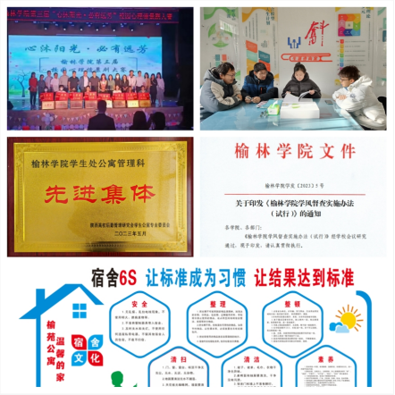 (四)创新模式,公寓建设不断加强。全面推进“一站式”学生社区建设,落实党建引领、阵地建设、队伍进驻、服务下沉和文化浸润五项重点任务,打造党团活动室、心理驿站、职业创业指导室、少数民族学生工作室、国防教育工作室育人阵地,全方位满足学生成长需求。不断完善学生社区基础设施,着力加强学生社区文化建设,持续开展宿舍文化节、文明宿舍评比活动,充分发挥学生社区在思政教育中的前沿阵地作用。大力推行“6S管理”模式,认真执行学生宿舍安全、内务卫生达标、宿舍学风建设等公寓管理制度,出台《bat365正版唯一官网学生公寓禁烟管理规定》。加强学生宿舍管理工作人员业务培训,不断提升管理水平和服务质量。学校党政、学工干部践行一线规则,扎实开展“走进社区问需求,畅谈平凡话奋斗”活动,指引学生奋斗之路,补足学生精神之钙。五年来,bat365公寓管理服务工作成绩突出,2次荣获陕西高校学生公寓先进集体,4人分别被授予“陕西高校学生公寓服务标兵”和“陕西高校学生公寓优秀员工”荣誉称号。