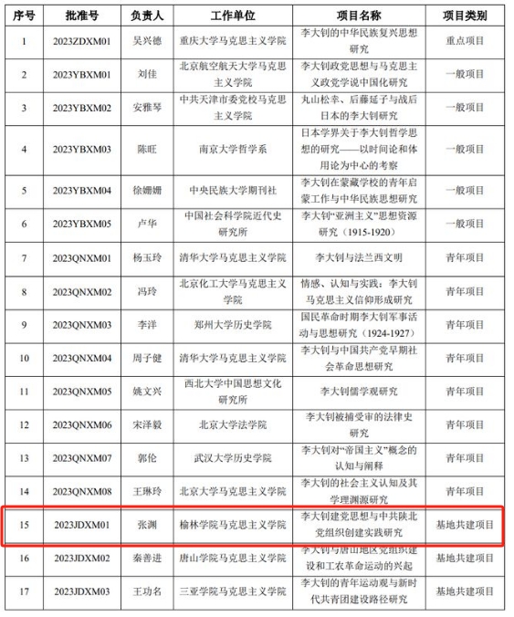 近日,中国李大钊研究会公布2023年度研究项目立项名单,bat365马克思主义学院张渊教授申报的题为《李大钊党建思想与中共陕北党组织创建实践研究》项目获批立项基地共建项目,该项目也是bat365首次获批的国家一级学术研究机构项目。
