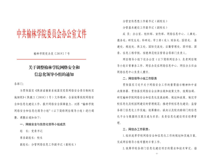 学校成立“榆林学校网络安全和信息化工作领导小组”,组长由学校党委书记担任,常务副组长由学校校长担任,由学校三位副校长担任副组长,下设办公室(网信办),办公室设在网络信息中心。成立由校内外业务专家组成的学校信息化专家委员会,保障领导小组工作决策的科学性。