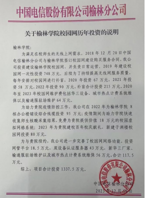 近年来,在学校党委和行政的正确领导下,网络信息中心通过积极调研西安高校信息化建设,主动克服学校自有信息化建设资金不足的困难,建议学校多渠道融资,通过银校合作,运营商投资等模式,在网络安全与信息化事业上交出了一份沉甸甸的成绩单。截止目前网络安全与信息化建设累计投资4669万余元,其中“十三五”期间,累计完成投资2864万元,其中中央财政投资1000万元,学校投资570万元,建行投资526万元,中国电信榆林分公司投资768万元。在“十四五”期间,累计完成投资1805万元,2022年长安银行投资536万,2023年长安银行投资700万,中国电信榆林分公司投资569万元。