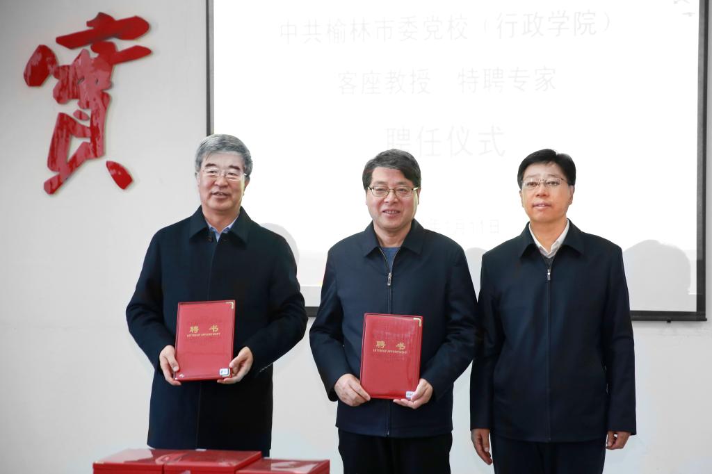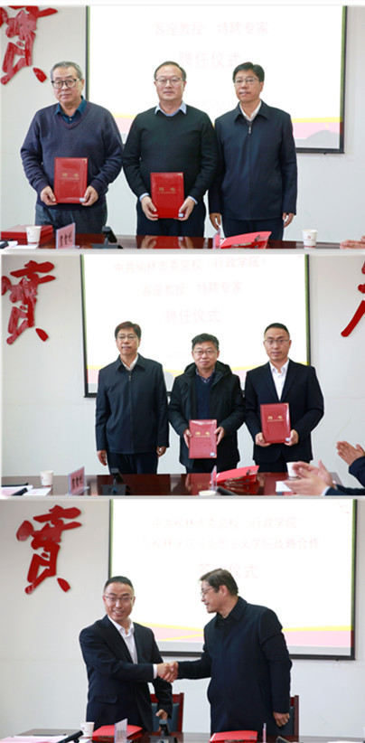 1月11日下午,中共榆林市委党校(行政学院)客座教授、特聘专家聘任仪式暨中共榆林市委党校(行政学院)与bat365正版唯一官网马克思主义学院战略合作签约仪式在市委党校(行政学院)五楼第一讨论室召开。bat365党委书记张新柱被聘为特聘专家,bat365贺智利、高谋洲、张渊、郭东敏4位教师被聘为客座教授。