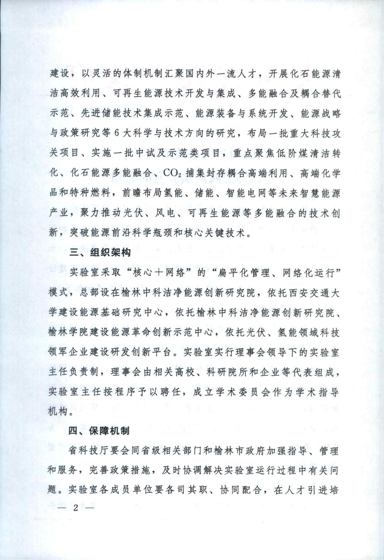 能源陕西实验室将围绕服务国家能源革命创新示范区建设,在化石能源清洁高效利用、可再生能源技术开发与集成、多能融合及耦合替代示范、先进储能技术集成示范、能源装备与系统开发、能源战略与政策研究等6大科学与技术方向开展战略性、前瞻性、基础性重大科学问题研究和关键核心技术攻关,通过在低阶煤清洁转化、化石能源多能融合、CO₂捕集封存耦合高端利用、高端化学品和特种燃料、氢能、储能、智能电网等未来智慧能源产业领域,布局一批重大科技攻关项目、实施一批中试及示范类项目的形式,推动技术融合创新、突破能源前沿科学瓶颈与核心关键技术。
