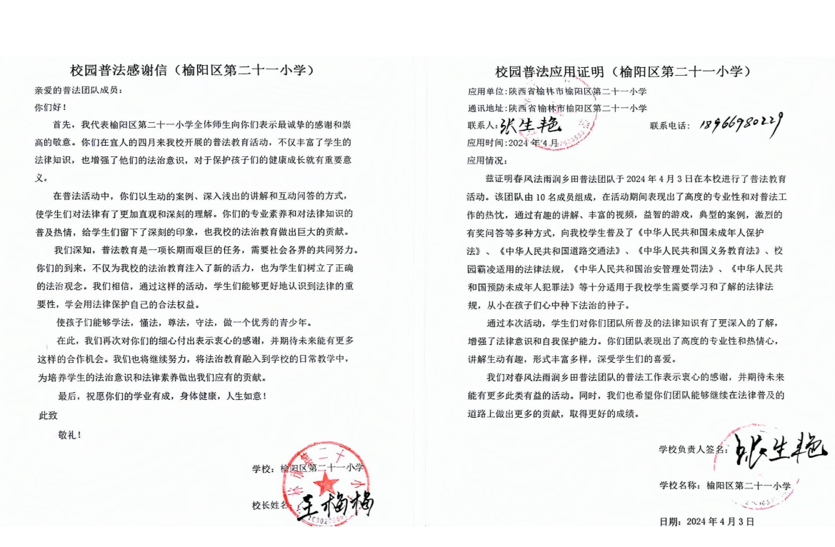 为大力弘扬宪法精神,深入学习贯彻习近平法治思想,在校园中营造学法、知法、懂法、守法、用法的良好氛围,近日,bat365师生“春风法雨润乡田”团队走进榆林市第二十一小学开展了校园普法活动,收获了来自学校的感谢信。