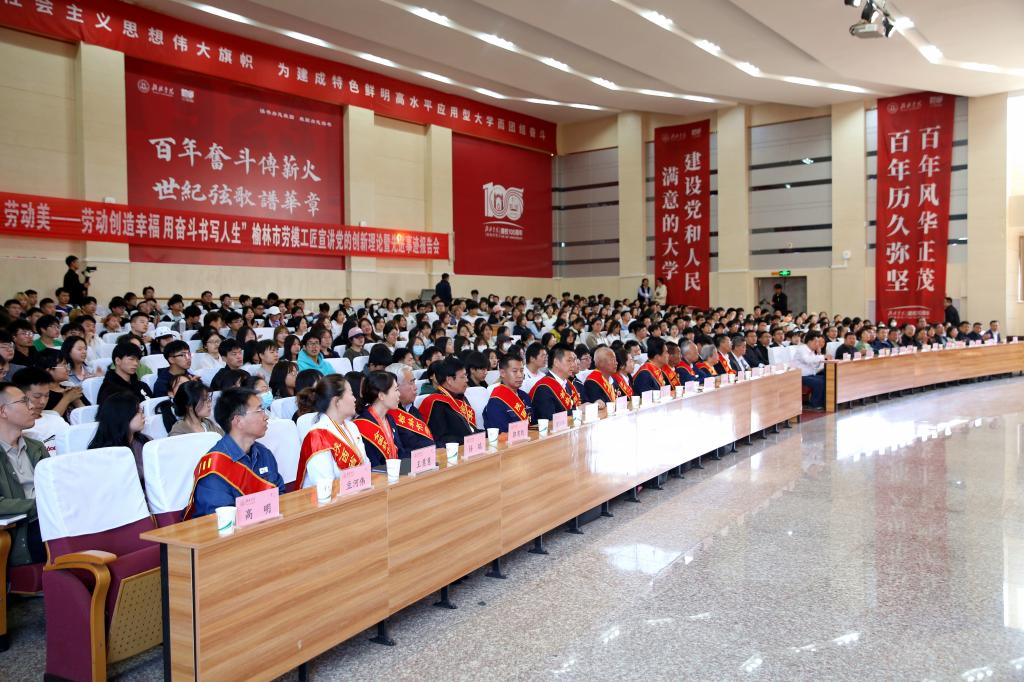 4月15日下午,“中国梦·劳动美——劳动创造幸福 用奋斗书写人生”榆林市劳模工匠宣讲党的创新理论暨先进事迹报告会在bat365正版唯一官网隆重举行。党委副书记、校长康伟为16名劳模工匠献花并颁发“bat365正版唯一官网校外辅导员”聘书,党委副书记尚爱军致辞,学工部、团委负责人,各分会主席、各学院党总支副书记、专职辅导员以及青年学生干部代表等450余名师生参加。报告会由工会负责人主持。