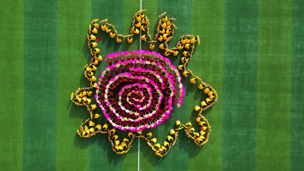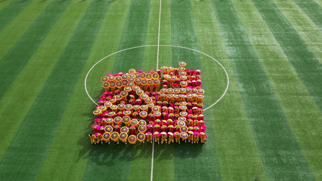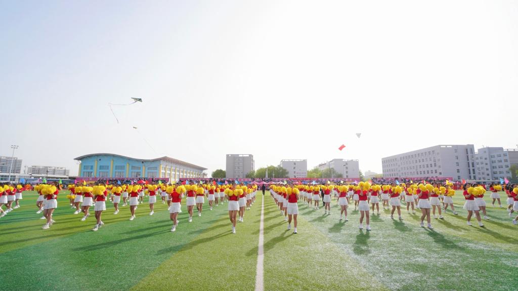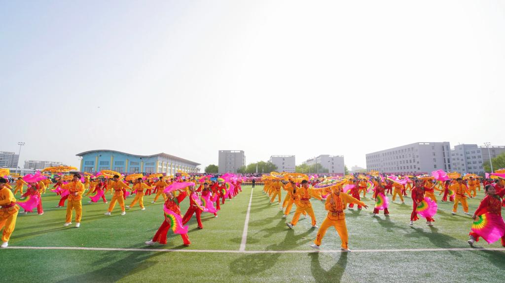 各方队有序退场,陕北秧歌和健美操精彩上演。学生们步伐整齐,动作一致,青春的身影欢快地飞舞在田径上,展现了新时代青年朝气蓬勃、昂扬拼搏的青春风采。