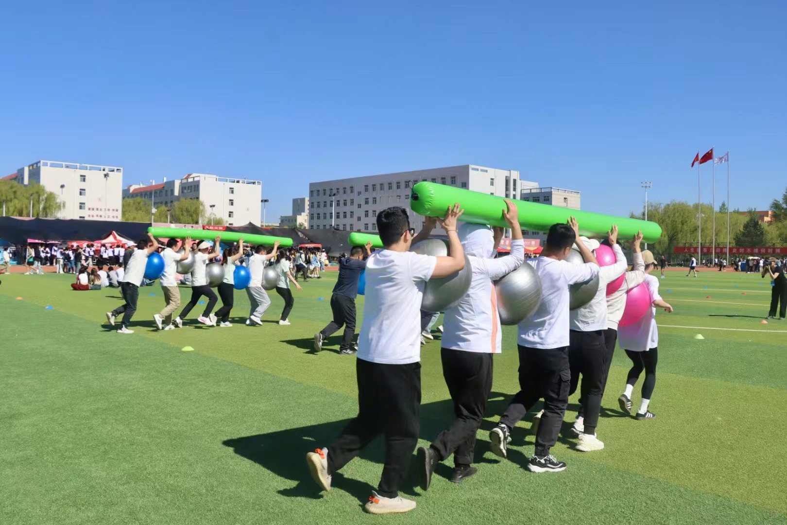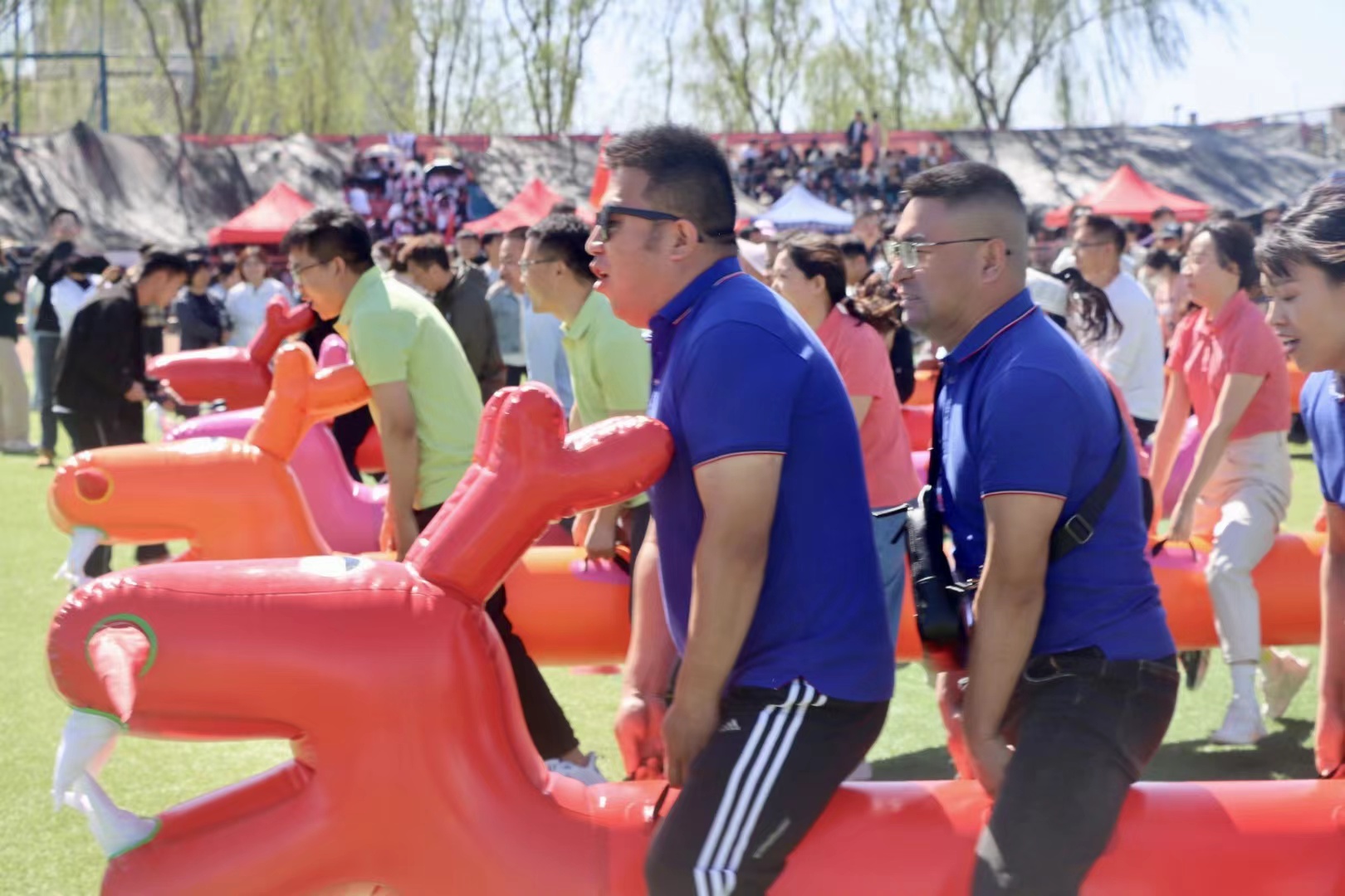 “龙行天下”比赛中,老师们骑坐在“龙舟”上,齐心协力向终点行进,目光所及,皆是矫健的步伐、跃动的身姿,草地上一条条“龙”左右摇摆,蜿蜒前行,时而还有被“龙”的一个摆尾摔下龙舟的老师,场面既温馨又欢乐。