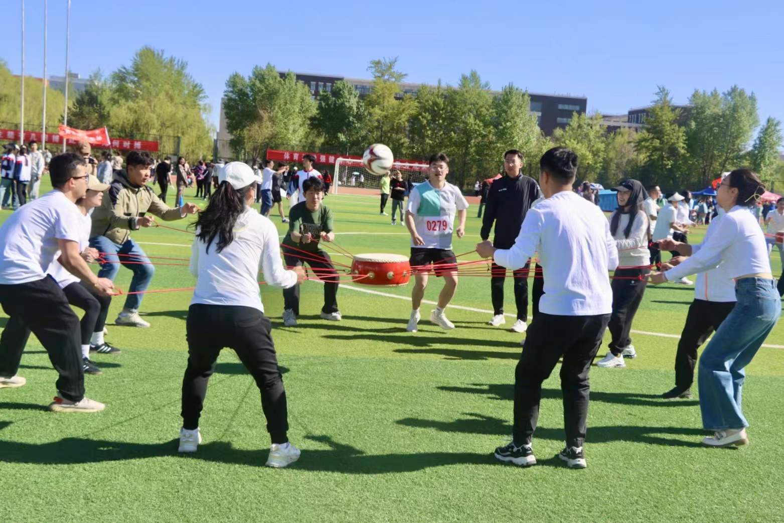 最后的“同心击鼓”比赛最具有挑战性,老师们齐心协力,从手上力度的控制到鼓面平稳的调节,都要实现高度的统一,这项运动考验团队的体力、智力和凝聚力。