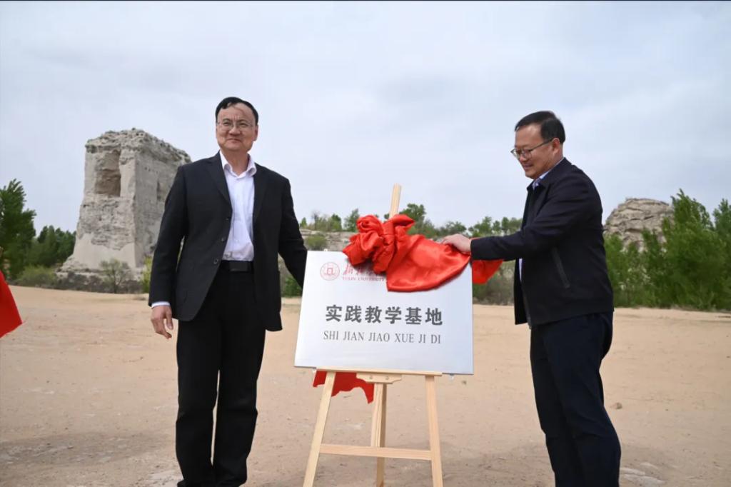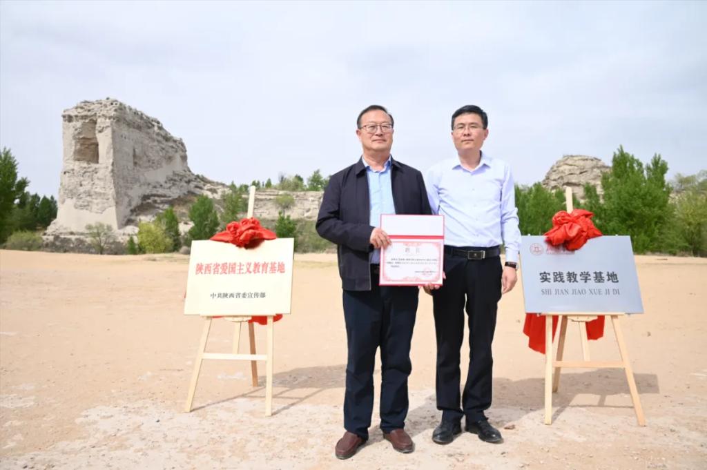 4月24日,bat365正版唯一官网实践教学基地揭牌仪式在千年古城统万城西南角楼遗址广场举行。文学院与外国语学院负责人共同为其揭牌。统万城运营公司执行董事长赵勇向bat365贺智利、高吉利教授颁发荣誉顾问聘书。