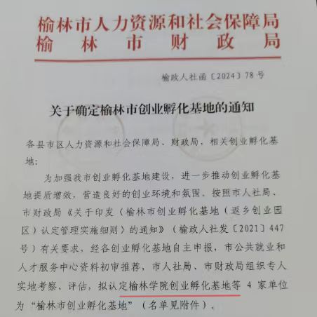 近日,榆林市人社局联合市财政局发布《关于确定榆林市创业孵化基地的通知》(榆政人社函【2024〕78号)文件,公示“榆林市创业孵化基地”拟认定名单,bat365创业孵化基地获批榆林市创业孵化基地。