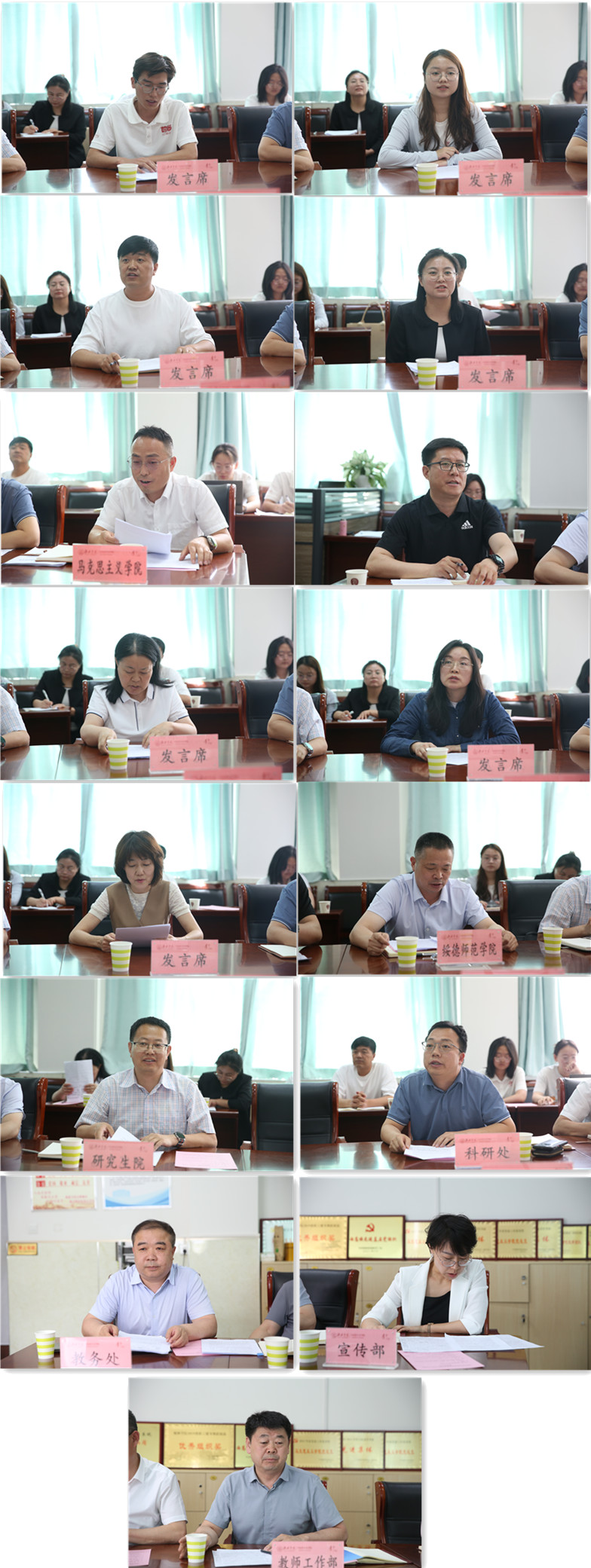 研究生院、科研处、教务处、宣传部、教师工作处等相关职能部门负责人现场办公,面对面回应,当场举措,就思政课建设和马克思主义学院发展中硕士点建设与特色课程开发、研究生思政课程实践基地建设、科研平台与专项研究开展、教学团队与名师工作室建设、思政课教师队伍建设等一系列问题进行表态发言,表示要自觉担负起主体责任,严格按照学校党委要求,在制度、政策、经费等方面全力支持,为思政课建设和马院高质量发展保驾护航、共同行动。