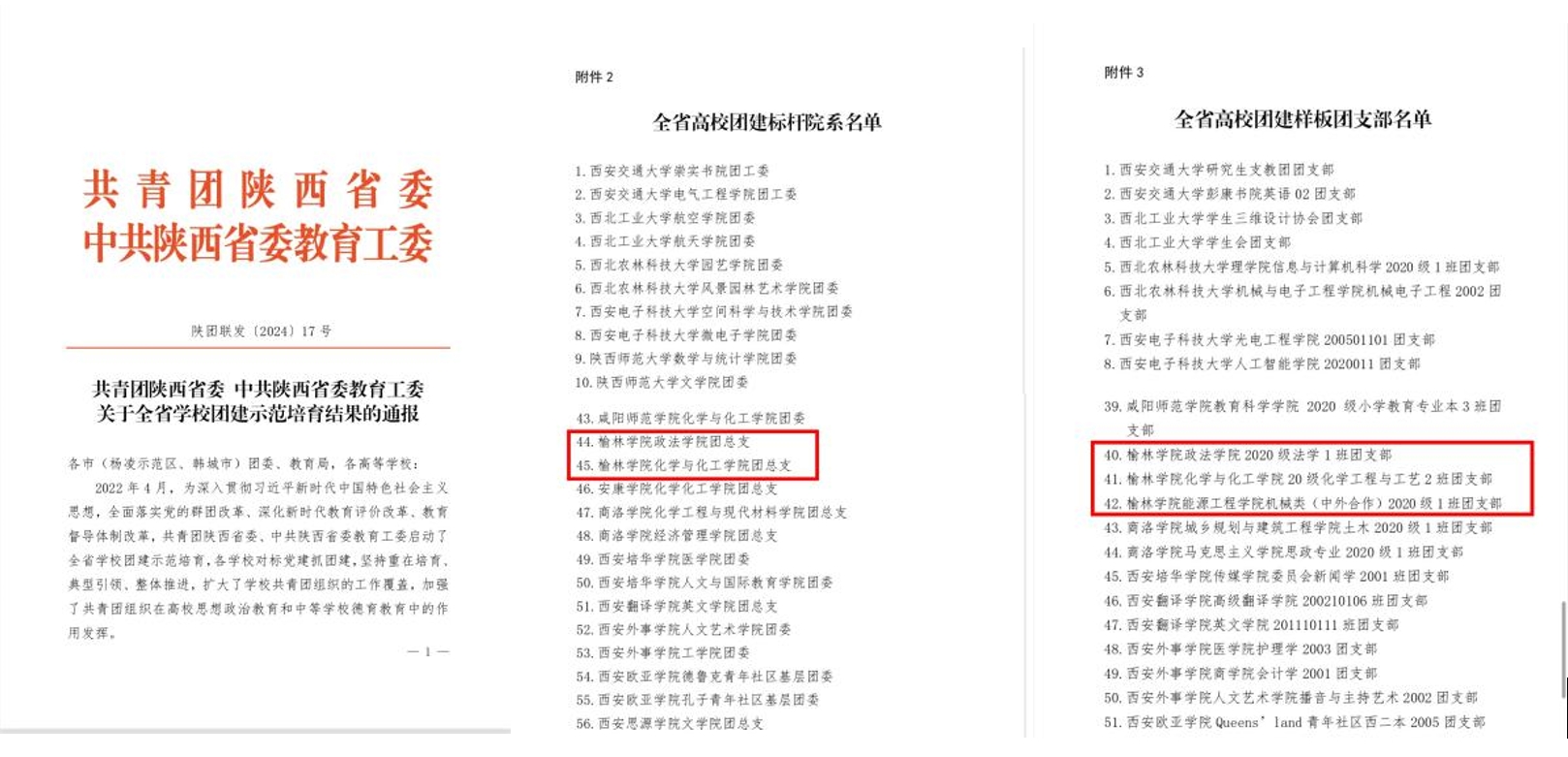 近日,共青团陕西省委、中共陕西省委教育工委印发《关于全省学校团建示范培育结果的通报》,bat3655个基层团组织全部通过全省学校团建示范培育验收,政法学院团总支、化学与化工学院团总支被认定为“全省高校团建标杆院系”,政法学院2020级法学1班团支部、化学与化工学院20级化学工程与工艺2班团支部、能源工程学院机械类(中外合作)2020级1班团支部被认定为“全省高校团建样板团支部”。