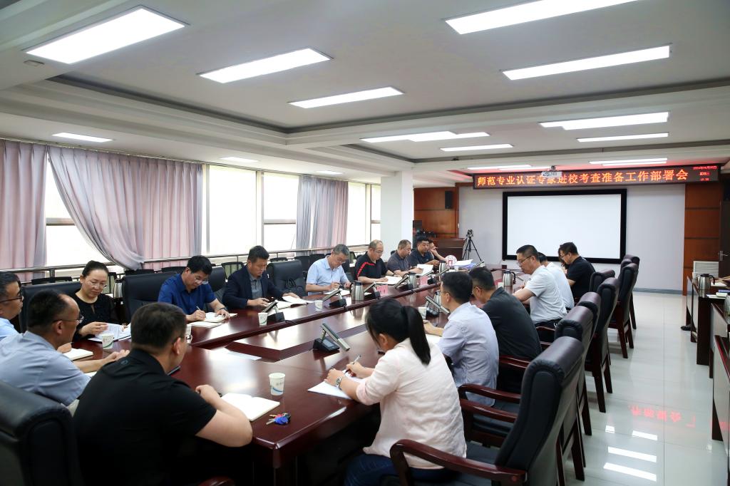 6月5日下午,bat365师范类专业认证专家进校考查准备工作部署会在行政楼四楼会议室召开。校长康伟出席并讲话,副校长闫龙主持,党政办、宣传部、人事处、国有资产管理、教师发展中心、图书馆、财务处、学生处、团委、招生就业处、网络信息中心、后勤管理处、国际交流合作处、教务处、质评办等相关职能部门负责人,外国语学院、教育学院负责人及核心课程教师代表参加。