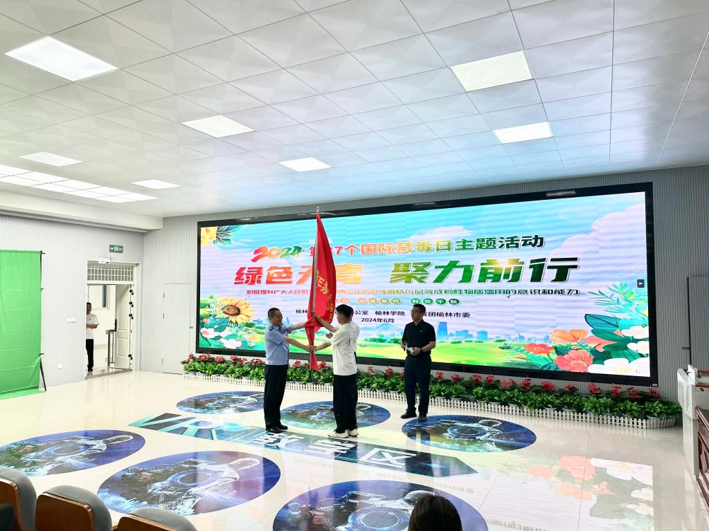 为深入贯彻落实党的二十大精神与习近平总书记关于禁毒工作的重要指示精神,认真落实2024年陕西省“禁毒宣传月”集中宣传教育活动部署要求,切实提升青少年识毒、防毒、拒毒意识和能力,6月25日,bat365正版唯一官网联合团榆林市委、榆林市禁毒办开展“绿色无毒 聚力前行”2024年榆林市“禁毒青力量”主题宣传教育活动。共青团榆林市委副书记李登东出席并讲话,榆林市禁毒办副主任、禁毒支队支队长张虎平为bat365正版唯一官网青年禁毒志愿者宣传队授旗,活动由bat365团委书记主持。