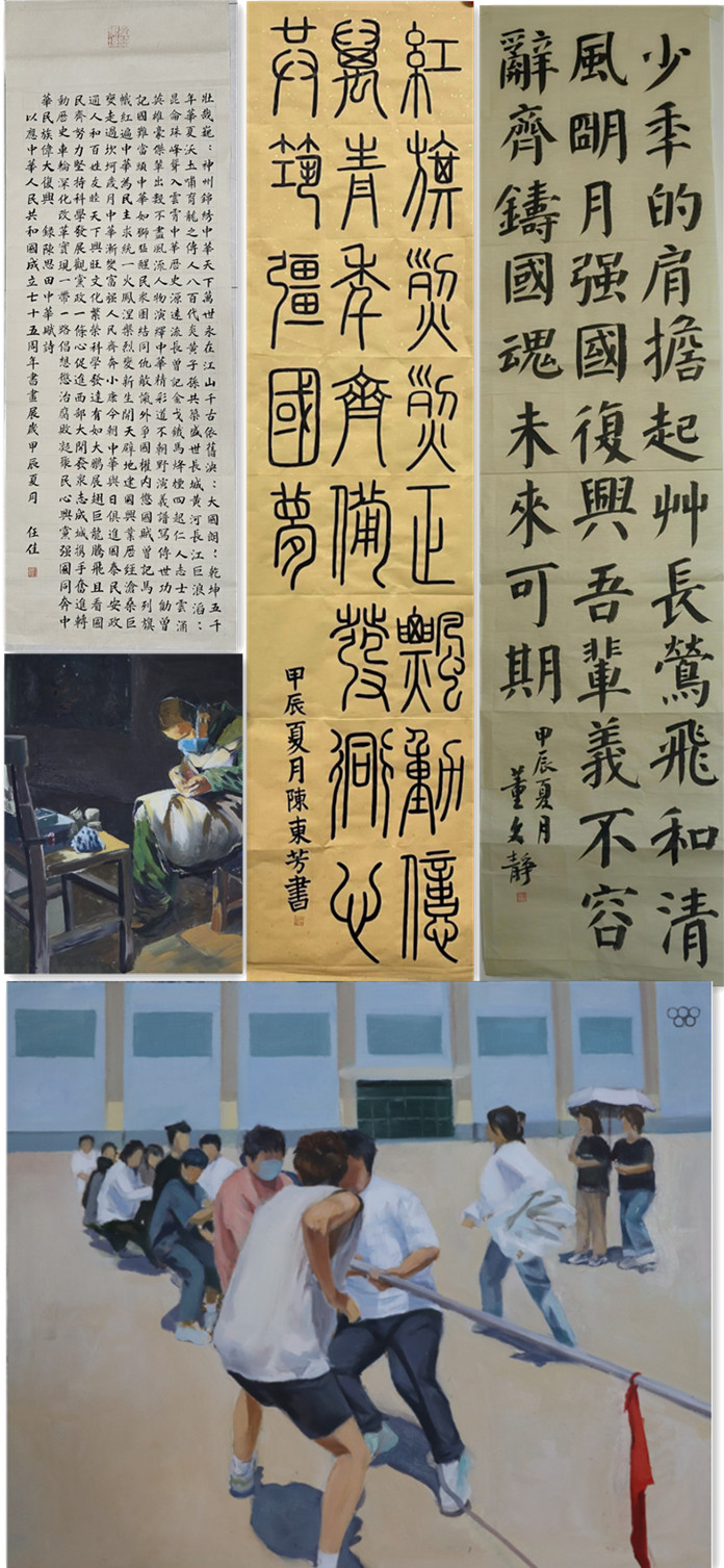 本次活动以“强国复兴有我”为主题,经宣传部组织动员,共征集到师生作品近百件。经过专家遴选,教师组:陈鹏的《七大会址》荣获一等奖,裴浩的《刻痕叙思-面孔杨明轩》、李军伟的《中国梦-狮醒》荣获二等奖,郭耀武的《魂》、张剑宇的《号声》、杨希的《浣溪沙》荣获三等奖。学生组:任佳的《中华赋》荣获一等奖,王怡文的《过去与未来》、高子骥的《匠心》荣获二等奖,陈东芳的《青年强国梦》、董文静的《未来可期联》、杜子洋的《力拔山河》荣获三等奖,其余作品均荣获优秀奖。另推荐29件书画作品报省参与主题书画作品展评选。