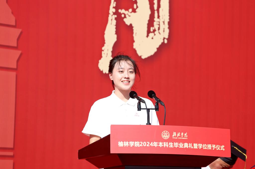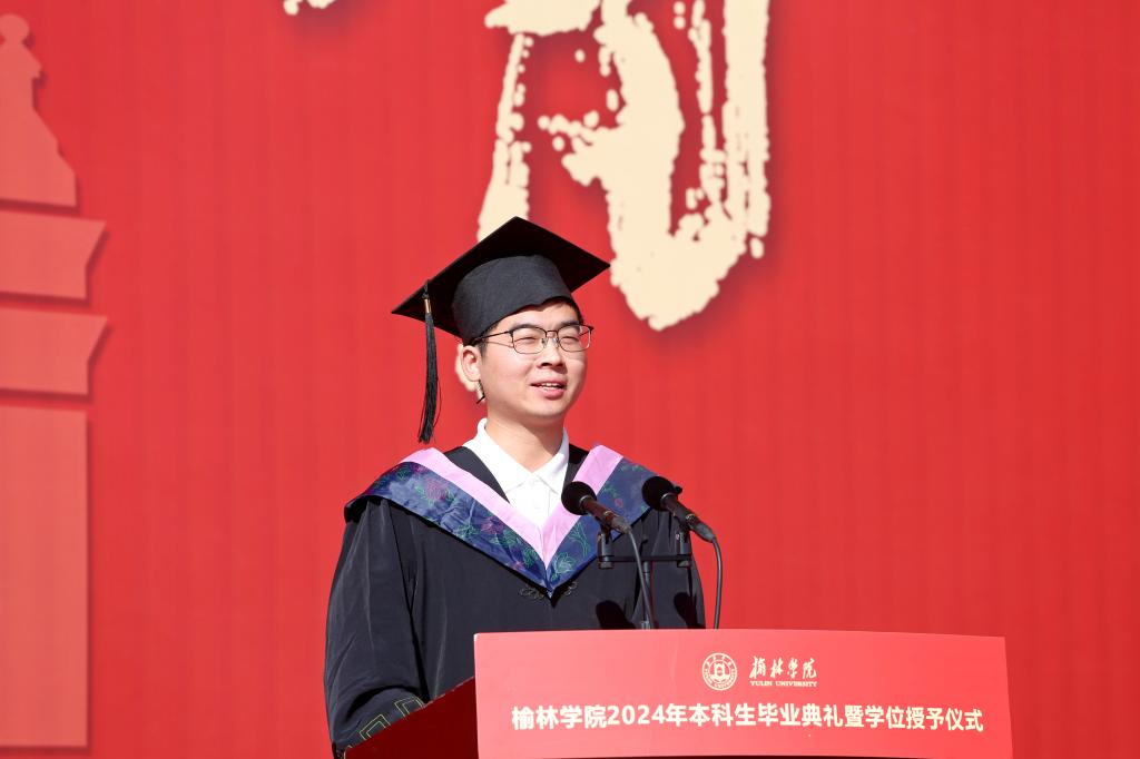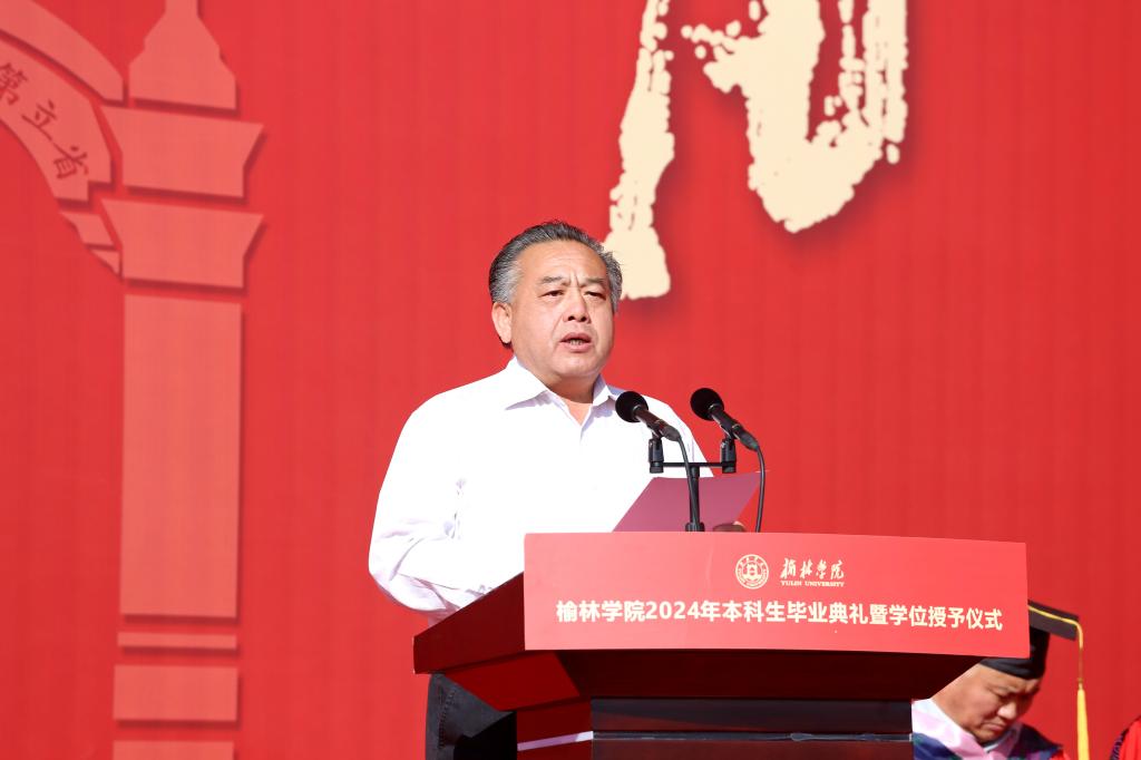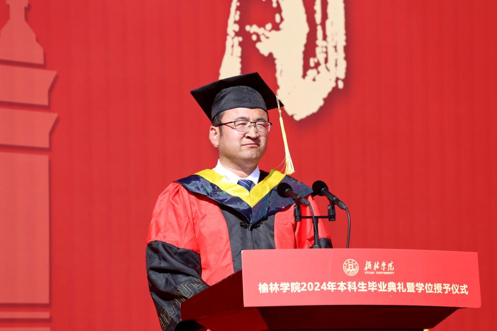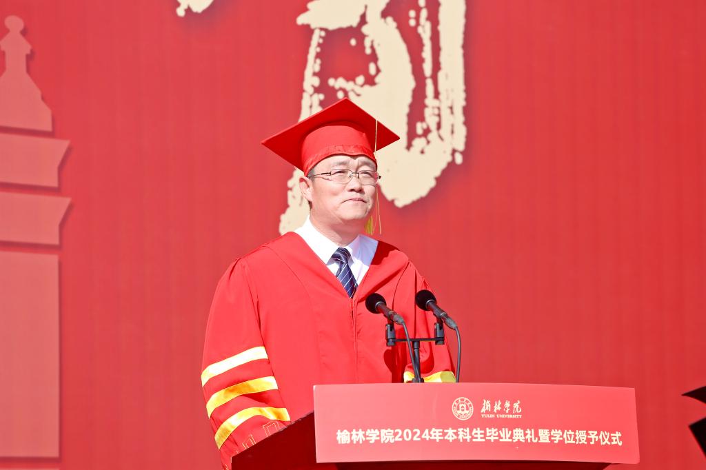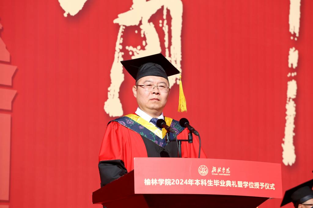 康伟代表学校向全体毕业生表示最热烈的祝贺,寄语毕业生:让奋斗成为我们坚定的传承。借用三首陕北民歌提出三点嘱托:一是唱响《东方红》,以丹心爱国家,铸牢读书报国的高远志向。唯有将个人发展融入到国家发展之中,扎根人民,人生道路才会有坚实的基础和正确的方向。希望同学们做一个有家国情怀的人,因为家国情怀将是你一生进步、进取不竭的动力。二是唱足《高楼万丈平地起》,以匠心铸精品,坚守拼搏奋斗的人生追求。“躺平”和“奋斗”是当今时代的两个网络热词,希望同学们记住,“躺平”绝不是奋斗者的姿态,也不是追求美好生活的人生态度。经过四年的学习,“奋斗”的精神已经流淌在你们的血液里,镌刻在你们的灵魂深处。理想的琴,只有拔动奋斗的弦,才能奏出人生美妙动听的乐章。三是唱亮《信天游》,以初心守正道,锤炼律己向善的高尚品格。希望同学们记住,热爱和善良会助力你们获得更多幸福的力量。同学们永远是bat365正版唯一官网最靓丽的名片,希望你们在以后的工作和生活中乐观向上,在平淡寂寞中蛰伏积淀,在欢呼喝彩中谦虚谨慎;更希望你们在人生的跋涉中心怀阳光,积跬步以致千里,尽精微而成广博,遇见最好的自己。