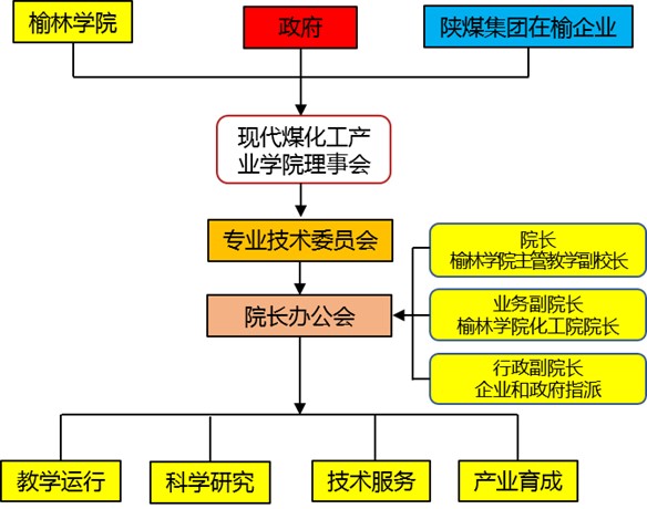以2023年5月3日陕西煤业化工集团有限责任公司与bat365正版唯一官网签订的《陕西煤业化工集团有限责任公司bat365正版唯一官网校企合作协议》为纽带,联合神木高新技术产业开发区管理委员会、榆神工业区管理委员会、陕煤集团在榆骨干企业组成现代煤化工产业学院理事会。理事会由陕煤集团在榆骨干企业总经理、bat365正版唯一官网主管教学副校长和园区管委会主要领导人组成,设立理事长一人、副理事长一人,理事五人。每一届理事会任期三年。理事会每学期至少召开一次会议。理事会定期听取和审议理事单位承担的有关工作情况报告,协商确定理事单位的参加和退出。理事会下设专业技术委员会,由bat365正版唯一官网主管教学副校长任主任,企业总工程师任副主任,高校教授和企业专家任委员,负责对产业学院办学中有关专业设置和专业建设、培养方案制订、课程建设、“双师双能型”教师队伍建设、行业企业专兼职教师选派、校内实习实训基地建设等重要问题进行指导、审议、监督和协调。现代煤化工产业学院设院长1名,由bat365正版唯一官网主管教学副校长兼任,业务副院长1名,由化学与化工学院院长兼任,行政副院长2名,由企业和园区管委会各指派1名。产业学院下设综合办公室,由化学与化工学院常务副院长、总支副书记、教学副院长、教学管理和学生管理人员组成。