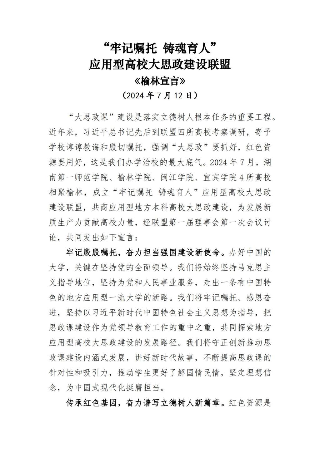 经2024年7月12日,“牢记嘱托 铸魂育人”应用型高校大思政建设联盟成立预备会暨第一届理事会第一次会议讨论,达成了符合联盟建设与发展的《榆林宣言》,现予以发布: