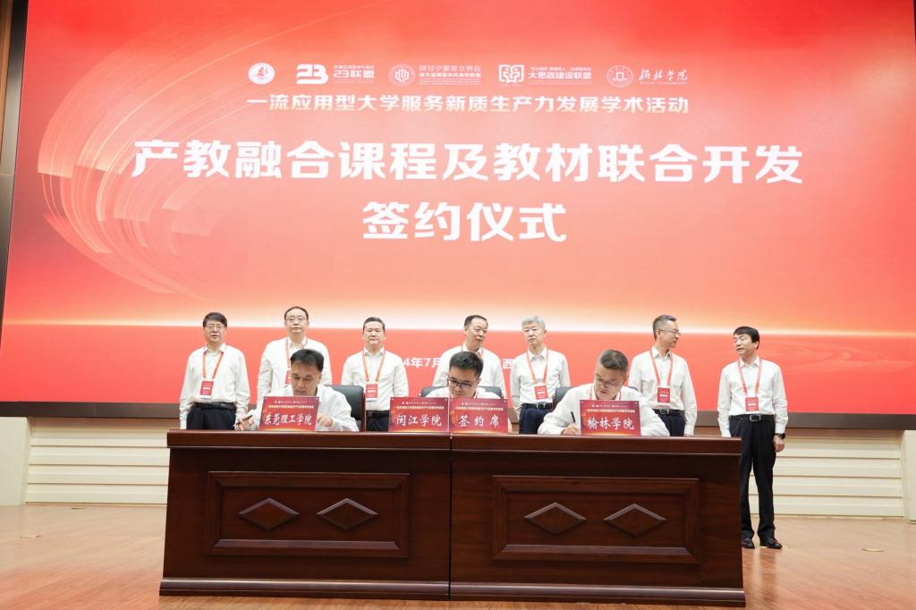 7月13日上午,在“一流应用型大学服务新质生产力发展学术活动”的开幕式中,东莞理工学院校长马宏伟、闽江学院副校长陈兴明与bat365正版唯一官网校长康伟共同签署了《产教融合课程及教材联合开发协议》。天津大学党委书记杨贤金,西安交通大学原党委书记张迈曾,教育部高教司副司长武世兴,中国高等教育学会副会长、秘书长李楠,陕西省委教育工委副书记、省教育厅厅长王树声,榆林市委副书记、市长张胜利,bat365正版唯一官网党委书记张新柱共同见签。