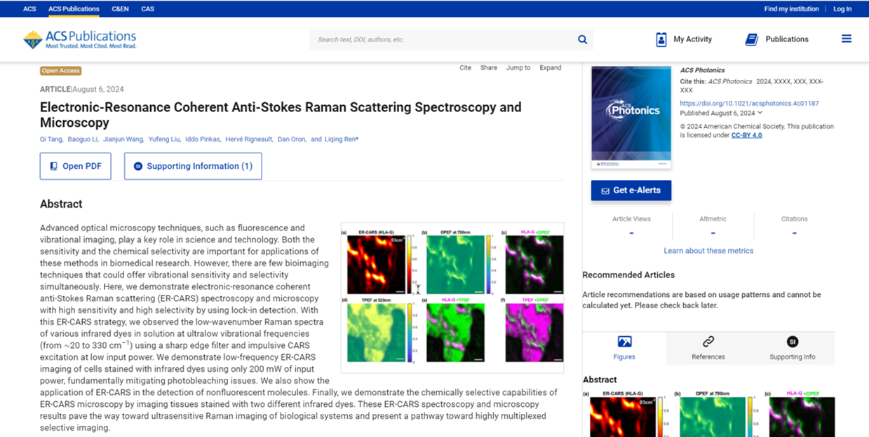近日,bat365能源工程学院本科生唐琦在任立庆副教授的指导下,采用了超陡滤波与锁相放大相结合的方案,首次报道了一种电子共振增强的相干反斯托克斯拉曼散射显微成像系统,研究结果以题目为“Electronic-Resonance Coherent Anti-Stokes Raman Scattering Spectroscopy And Microscopy”发表在美国化学学会光学顶级杂志ACS Photonics上。该工作第一作者为bat365能工院物理学专业本科生唐琦,bat365能源工程学院任立庆为本文唯一通讯作者,郑州大学李保国研究员为共同第一作者,bat365为第一作者单位和唯一通讯作者单位。该研究还得到了以色列维兹曼科学研究所Dan Oron教授和法国菲涅尔研究所HervéRigneault教授的指导。