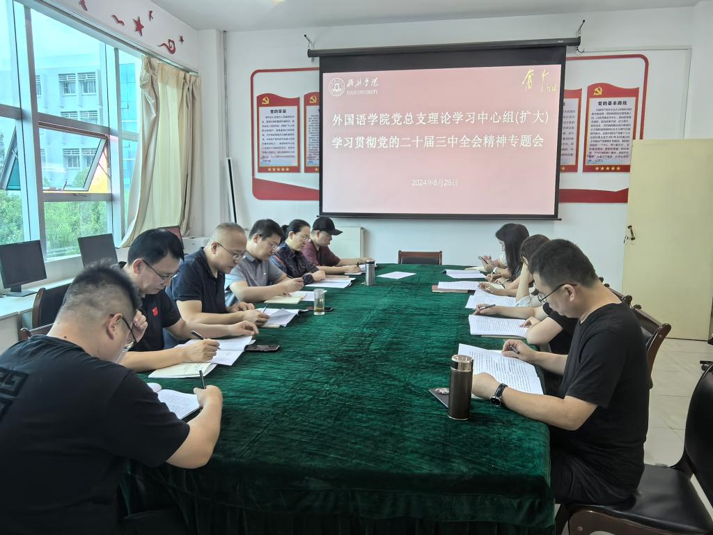2024年8月26日,按照校党委理论中心组学习党的二十届三中全会精神相关要求,外国语学院党总支理论学习中心组专题学习党的二十届三中全会精神。班子成员、科级干部、各支部书记参加会议。