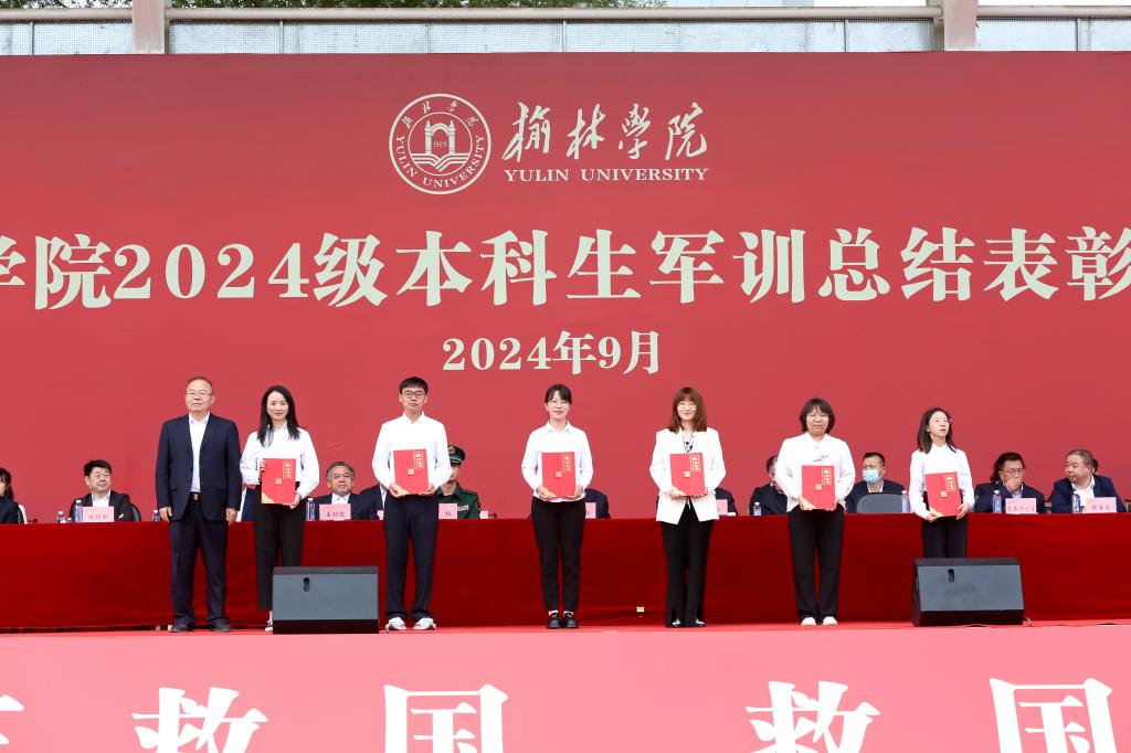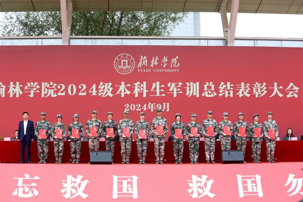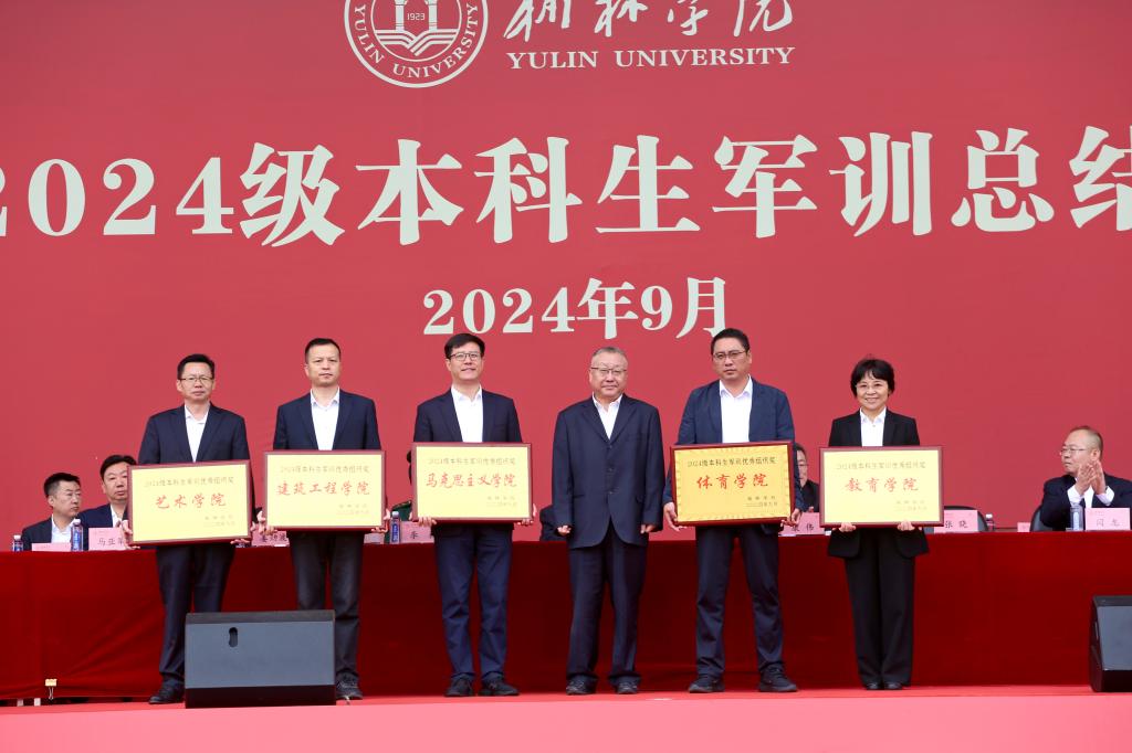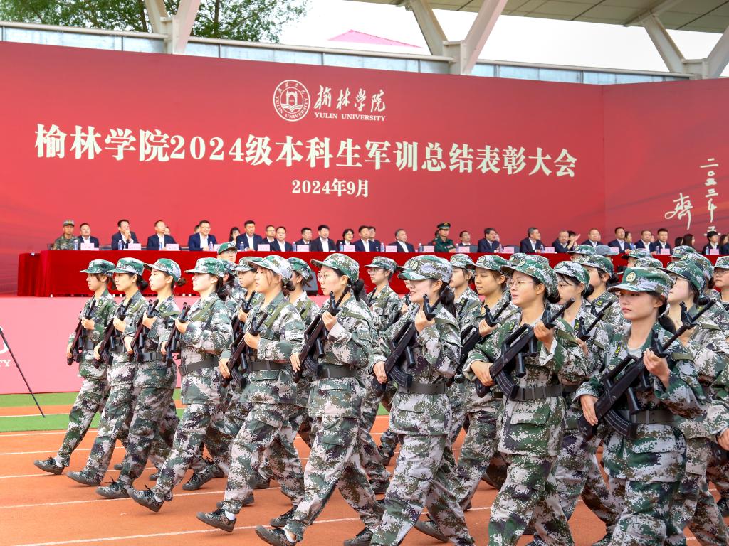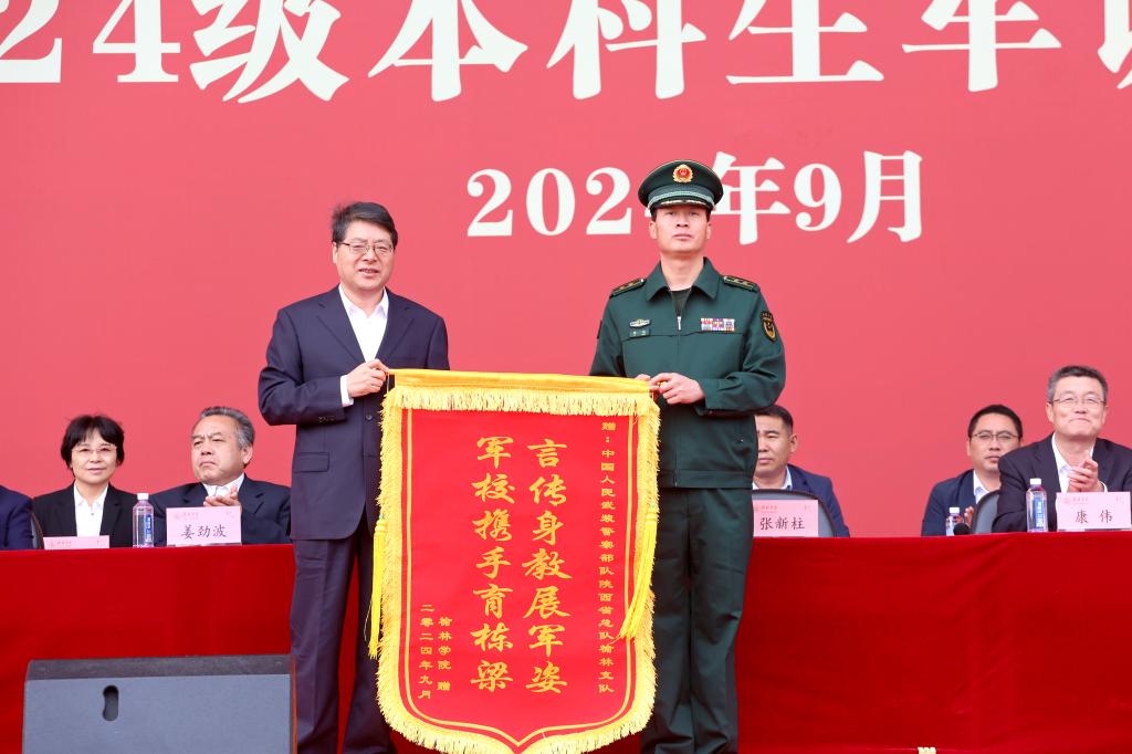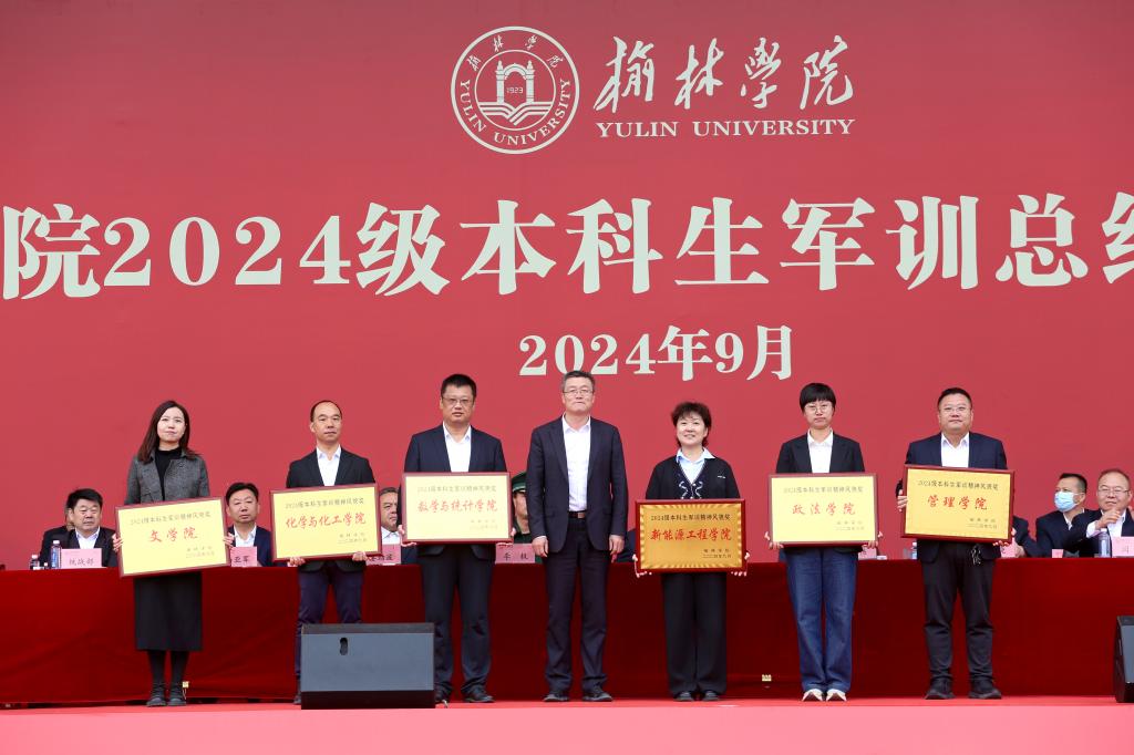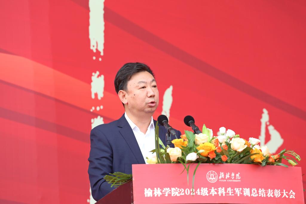 副校长马亚军代表学校向全体承训教官致以崇高的敬意和衷心的感谢,向圆满完成军训任务的全体同学表示热烈的祝贺。他指出,两周以来,同学们身穿绿色的迷彩服,早出勤、晚操练,用青春与汗水完成了大学生活的“第一课”。 这“第一课”是一堂国防课,也是一堂思政课,更是一堂“播种课”,同学们不仅学习了军事知识和军事技能,而且强健了体魄、磨练了意志,增强了遵守纪律、团结协作的意识,培养了吃苦耐劳、永不言败、坚韧不拔、迎难而上的精神品格,这都为即将开始的大学生活和以后的人生征程打下了坚实的基础。他向同学们提出四点希望,一是希望希望同学们将军训中的拼搏精神固化为优秀品质,将良好习惯固化为行为准则,将纪律观念固化为优良作风,将军事技能固化为扎实本领,在未来成长成才的路上攻坚克难、砥砺前行。二是希望同学们传承红色基因,赓续红色血脉,坚定不移听党话跟党走,争做有理想、敢担当、能吃苦、肯奋斗的新时代好青年,用实际行动践行“请党放心 强国有我”的青春誓言。三是希望同学们赓续奋斗精神,勇于拼搏,脚踏实地,在榆溪河畔求得真知、塑造真境、成就真我,练就过硬本领,擦亮奋斗底色。四是希望同学们在“五乐”育人实践中绽放光芒,享受阅读、敢于演讲,健体强身,爱上民歌,投身劳动实践,争做五乐育人的积极践行者,不断提升自己的综合素质。