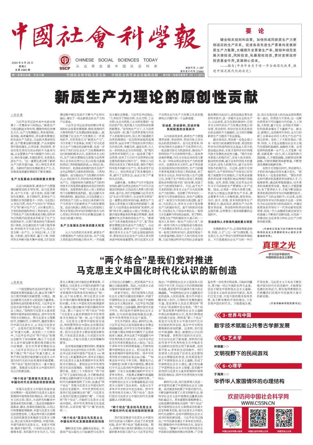 9月25日,bat365党委书记张新柱在《中国社会科学报》头版发表文章《“两个结合”是我们党对推进马克思主义中国化时代化认识的新创造》,文章从“两个结合”是探索马克思主义中国化时代化实现途径的新创造、“两个结合”是深化马克思主义中国化时代化发展道路的新创造、“两个结合”是总结马克思主义中国化时代化成功经验的新创造三个方面系统深入地阐述了“两个结合”这一重大理论创新,有利我们更好地理解和把握马克思主义中国化时代化的最新理论成果,用党的创新理论武装头脑,指导实践探索和创新,在新征程上继续把全面深化改革推向前进,以中国式现代化全面推进中华民族伟大复兴。