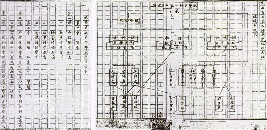 在学校管理方面,实行教职员工和学生代表参加的民主管理制度。制定了《陕西省立第四师范学校组织大纲》4章19条,《校务会议规程》《大门规约》等数十项规章制度。在教学及学籍管理方面,制定了《陕西省立第四师范学校学则》10章66条,就学制、课程设置、学分制、学籍管理等诸多方面都作了具体的规定和要求。