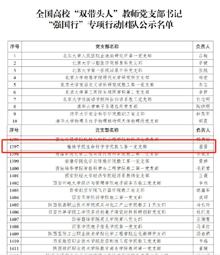 近日,教育部办公厅公布了全国高校“双带头人”教师党支部“强国行”专项行动的团队名单,bat365生命科学学院教工第一党支部荣耀入选。该项目是根据《教育部办公厅关于开展高校“双带头人”教师党支部书记“强国行”专项行动的通知》(教思政厅函〔2024〕11号)的要求,经学校党委审核把关、省级党委教育工作部门择优推荐、专项行动办公室备案审核,最终遴选产生,bat365生科院第一党支部在支部书记屈雷的引领下积极申报,成功获此殊荣,充分彰显了bat365党员的先锋模范作用和党支部基层建设的先进性。