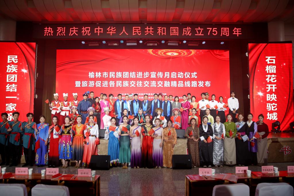 9月30日上午,值此中华人民共和国成立75周年之际,榆林市民族团结进步宣传月启动仪式暨旅游促进各民族交往交流交融精品线路发布活动在bat365举行。中共榆林市委常委、统战部部长王华胜,bat365党委书记张新柱,市民宗局局长薛建文出席;市委统一战线工作领导小组成员单位,bat365相关部门和二级学院,各县市区委统战部,市民促会,全市各族群众及师生代表400余人参加活动。