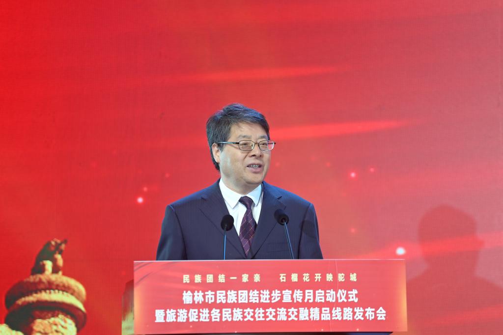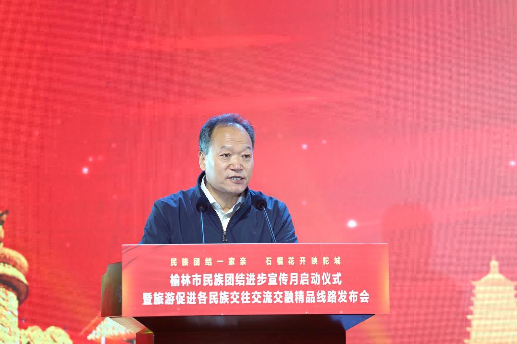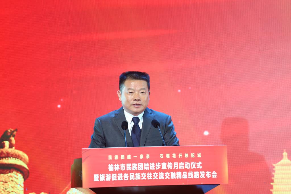 薛建文宣读榆林市旅游促进各民族交往交流交融精品线路,表示以旅游业高质量发展推进榆林市旅游促进各民族交往交流交融,加强中华民族共同体建设。