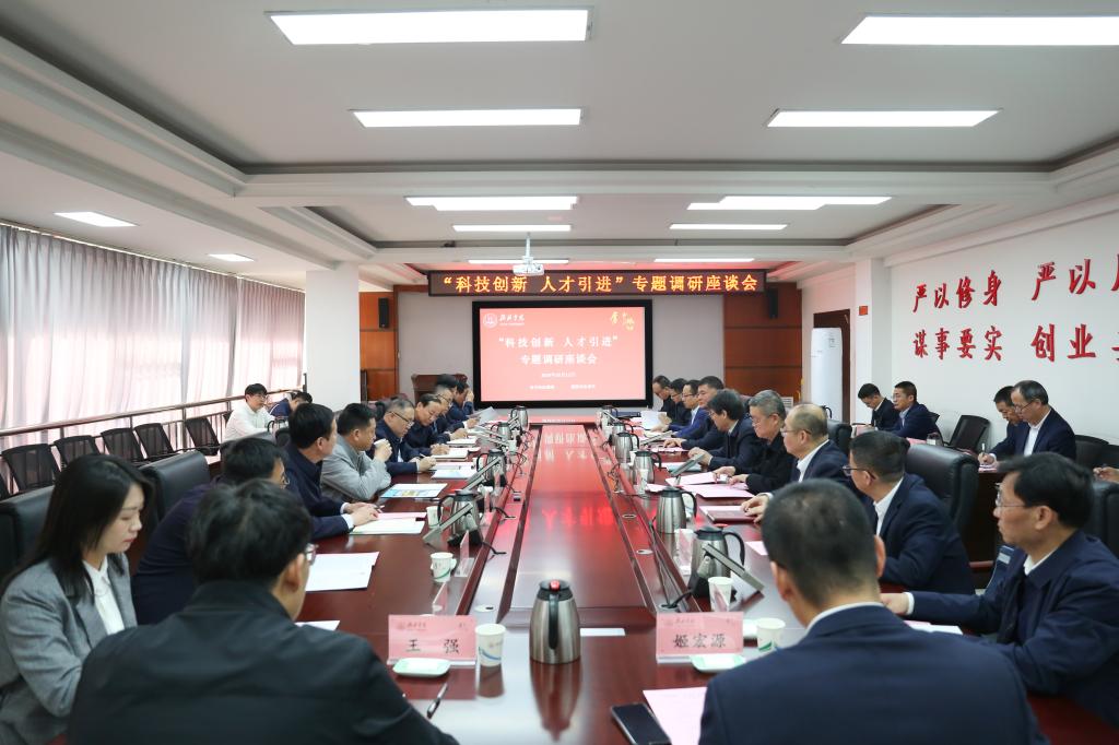 为了进一步推动教育、科技和人才一体化发展,促进创新链、人才链和产业链深度融合。10月11日上午,榆林市人大常委会党组书记、主任王国忠在榆林市人大常委会副主任常少海、秘书长杨啸中、教科文卫工委主任白万才、榆林市科技局局长乔杰、榆林能源集团党委书记、董事长薛卫东的陪同下来bat365就科技创新与人才引进工作开展专项调研并召开座谈会。bat365党委书记张新柱、校长康伟、副校长闫龙陪同调研并参加座谈。座谈会由市人大常委会副主任常少海主持。